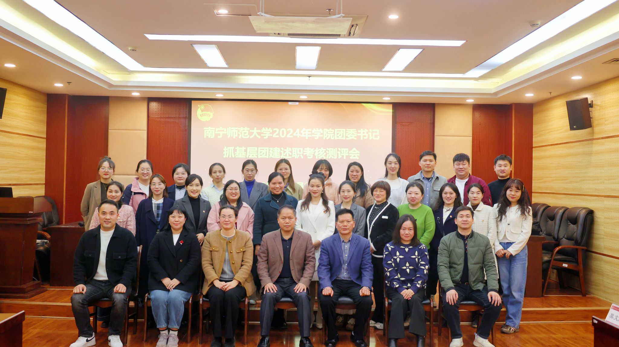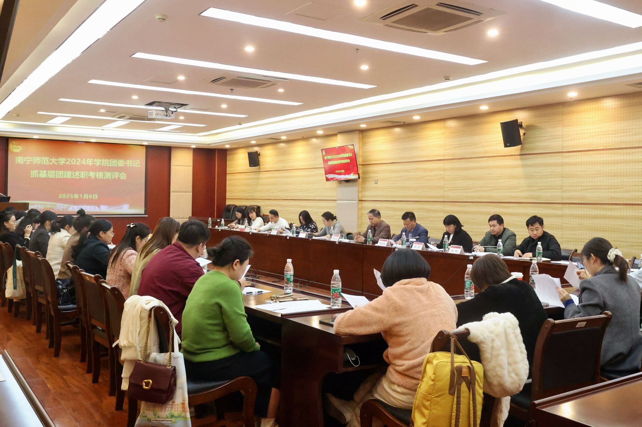 1月6日,beat365官网在明秀校区图书馆会议室召开2024年度学院团委书记抓基层团建述职考核测评会。党委学生工作部部长陈宗武、校团委书记区丽媛、马克思主义学院党委书记李玲、机关党委书记兼组织部副部长韦金能、校团委副书记梁秋、绩效办专职副主任莫文红担任测评会评委,校团委全体人员、各学院团委书记参加了本次会议。会议由校团委副书记何俊斌主持。
