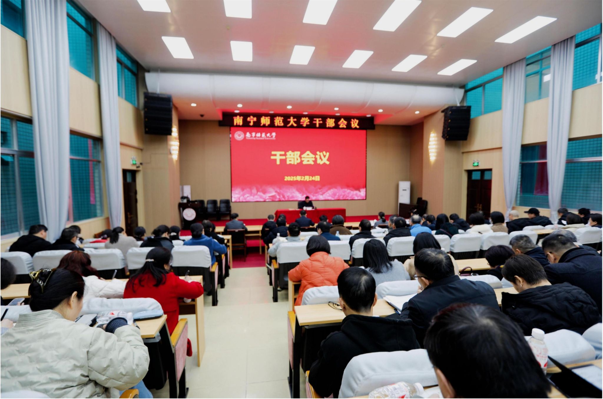 2月24日下午,beat365官网在明秀校区文星楼301报告厅召开干部会议。学校党委书记张鹏传达了全区组织部长会议、全区高校党的建设工作会议精神,就贯彻落实会议精神提出工作要求、作出安排部署。学校党委副书记、校长隆广庆,党委副书记唐荣双,副校长王国红、龙妮娜、卢远以及全体中层干部参加了会议。