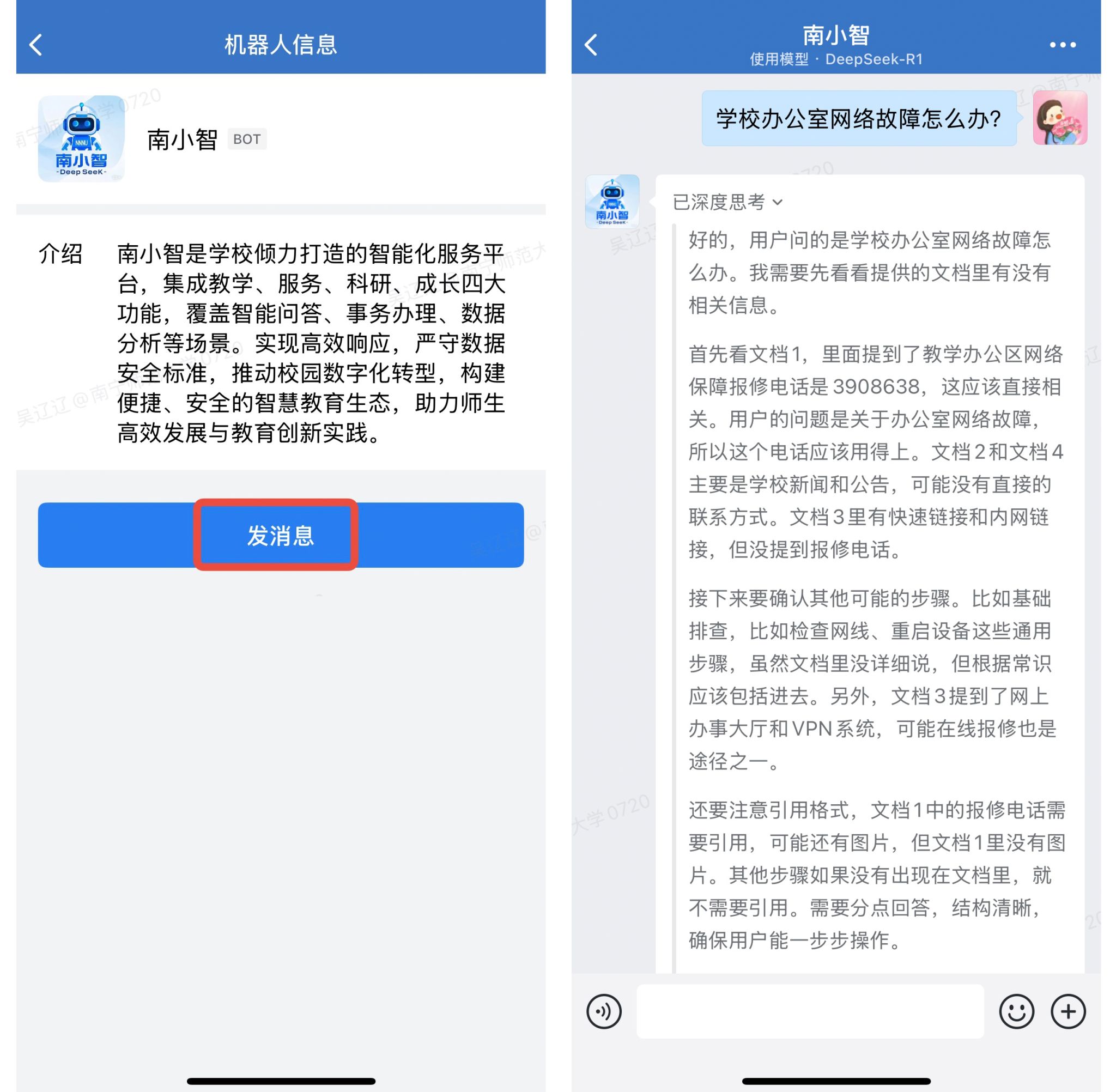 4.选择“南小智”并对话:在智能机器人列表中找到并点击“南小智”,单击“发消息”,在对话框中输入问题或咨询内容,即可获得解答。