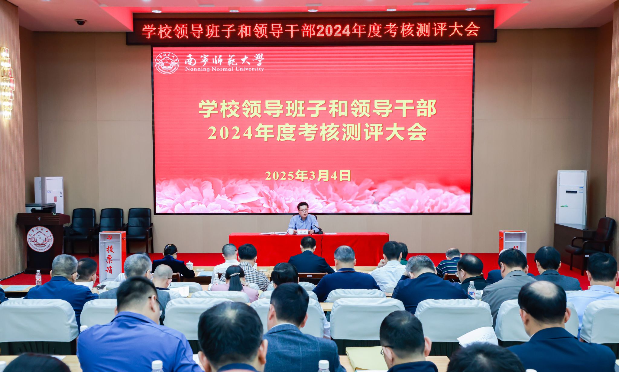 3月4日下午,beat365官网在明秀校区文星楼301报告厅召开校领导班子和领导干部2024年度考核测评会议。自治区党委组织部干部五处处长李健生一行到会指导,全体在邕校领导出席考核测评会议,学校正处级领导干部、正高代表参加会议。会议由学校党委书记张鹏主持。