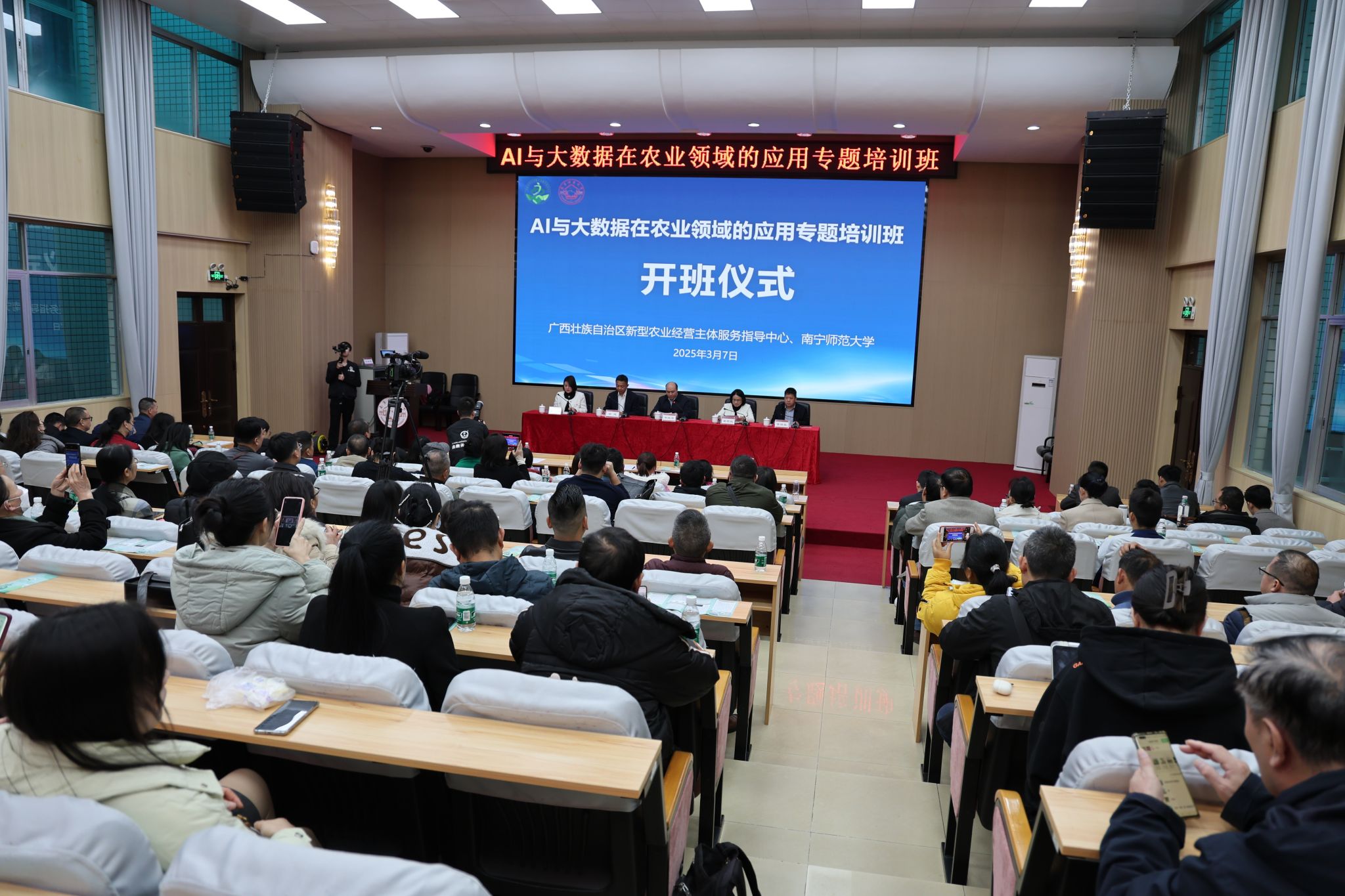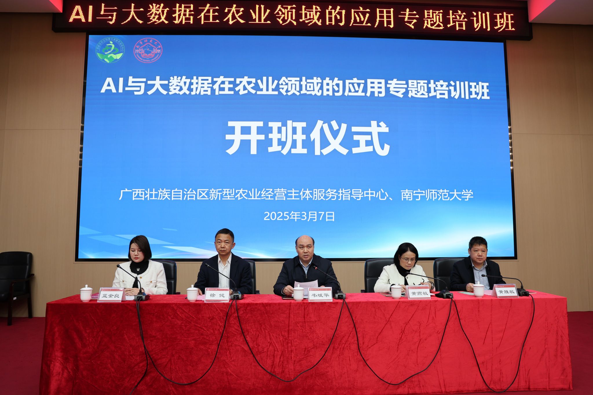 3月7日,beat365官网与广西壮族自治区新型农业经营主体服务指导中心携手,在beat365官网明秀校区举办了“AI与大数据在农业领域的应用”专题培训班。此次培训班吸引了180名来自全区各地市的涉农企业、农民专业合作社、家庭农场等代表踊跃参加。自治区农业农村厅农村合作经济指导处处长韦斌华、自治区新型农业经营主体服务指导中心主任蓝金良以及beat365官网科研管理处处长黄燕敏、继续教育学院院长徐健、地理与海洋研究院党委书记黄胜敏出席了开班仪式。