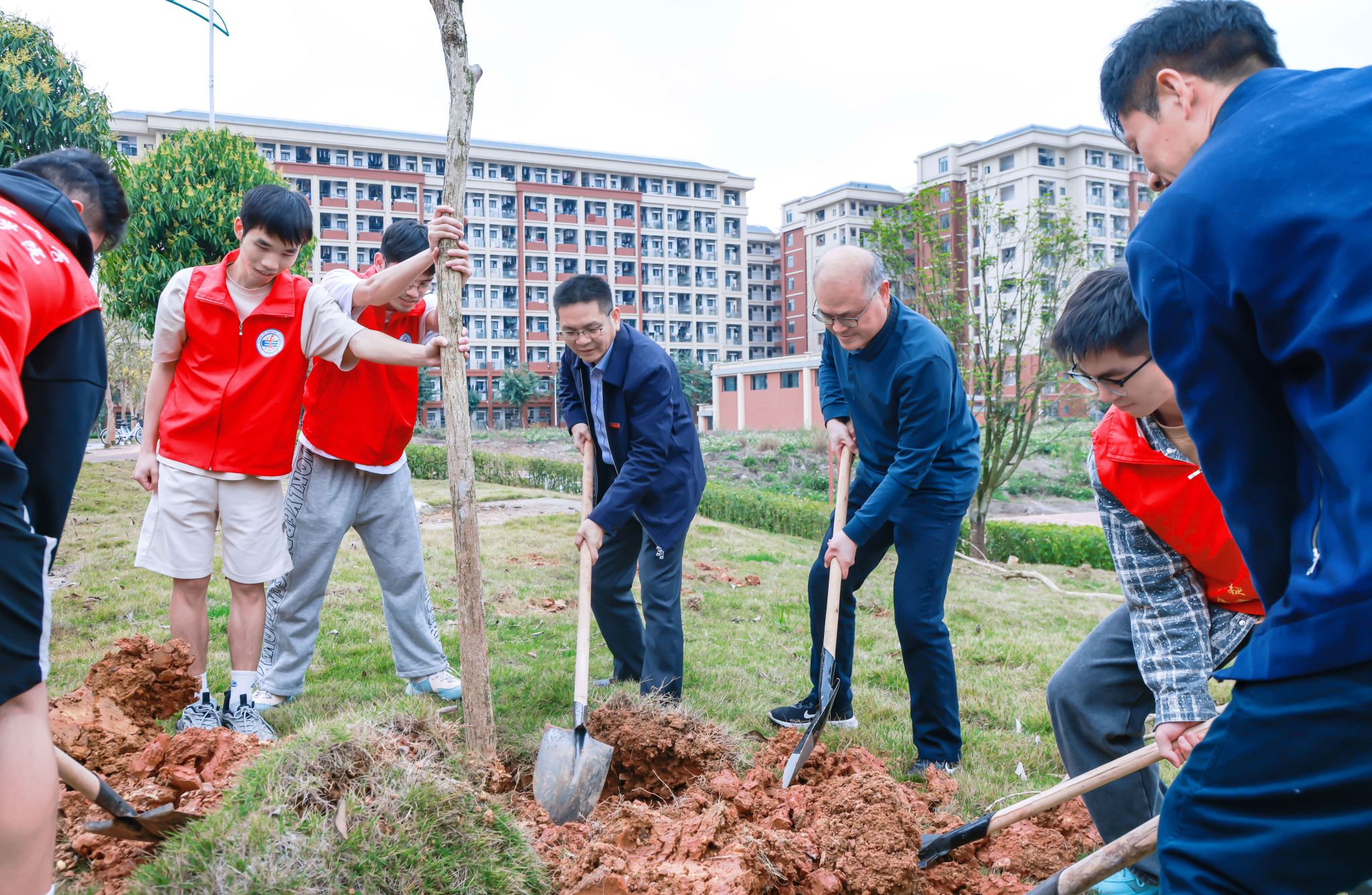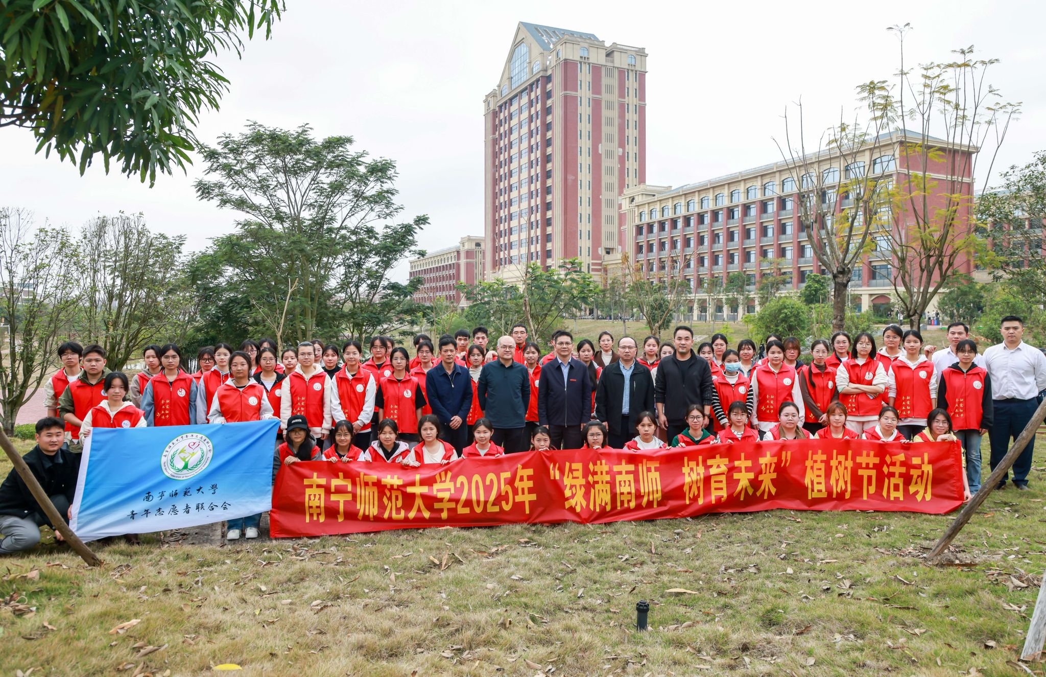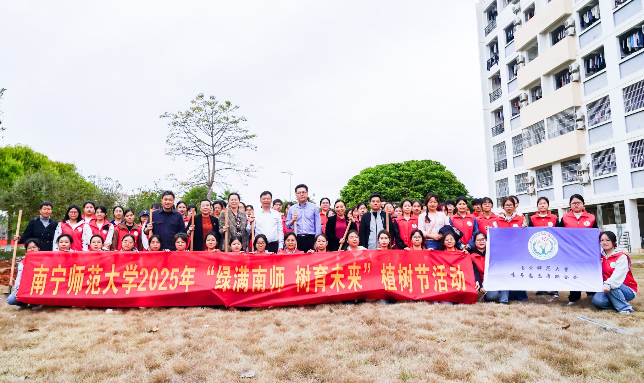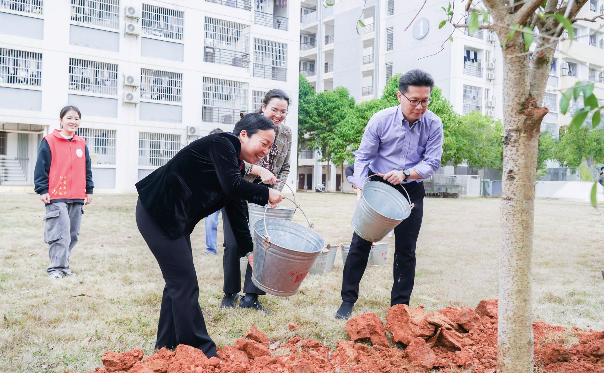 为树立beat365官网师生绿色发展理念、生态环保意识,积极投身美丽南师建设,3月12日上午,校团委联合后勤基建处分别在五合、武鸣校区开展了“绿满南师 树育未来”植树节活动。学校党委书记张鹏、校长隆广庆、副校长龙妮娜、总会计师梁家斌,相关部门负责人及学生志愿者参加了本次活动。