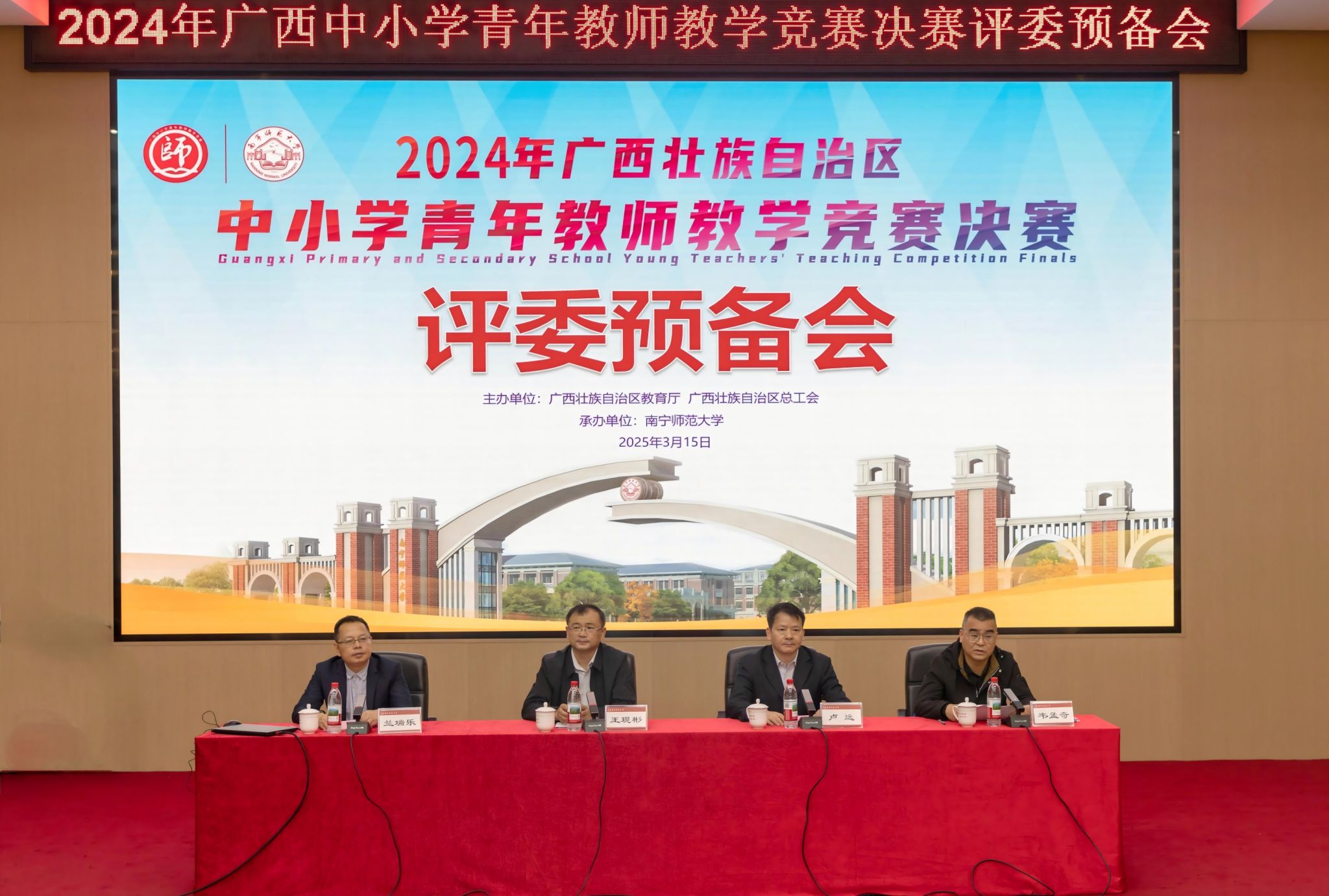 3月15—16日,由广西壮族自治区教育厅和广西壮族自治区总工会主办、beat365官网承办的2024年广西中小学青年教师教学竞赛决赛在明秀校区成功举办。自治区教育厅教师工作处副处长王现彬、自治区教育工会主席韦孟奇、beat365平台官方网站副校长卢远出席并讲话。