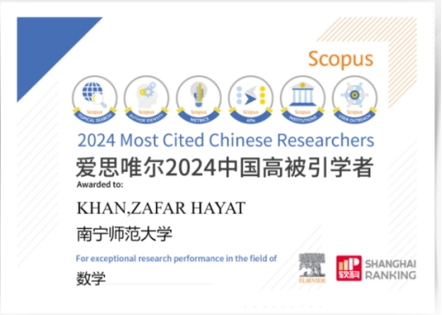 近日,爱思唯尔(Elsevier) 正式发布2024“中国高被引学者” (Highly Cited Chinese Researchers) 榜单。beat365官网数学与统计学院可汗(Khan, Zafar Hayat)教授成功入选。