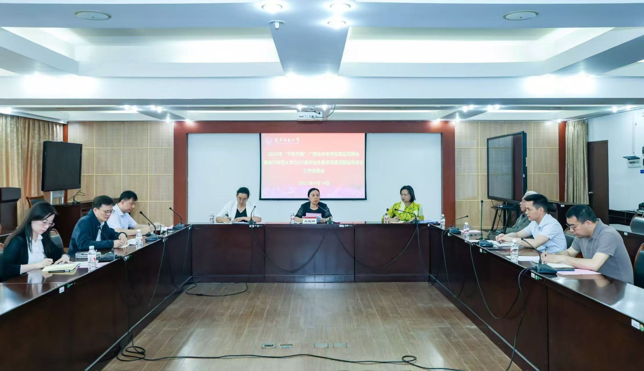4月16日上午,beat365官网2025年“千校万岗”广西大中专学生招聘会(beat365平台官方网站专场)暨beat365平台官方网站2025届毕业生春季攻坚促就业双选会在明秀校区鸿远楼409会议室召开。学校副校长龙妮娜,学校党办校办、党委宣传部、党委学生工作部(处)、校团委、招生就业处、后勤基建处、保卫处、网络信息中心等部门负责人参加了会议。