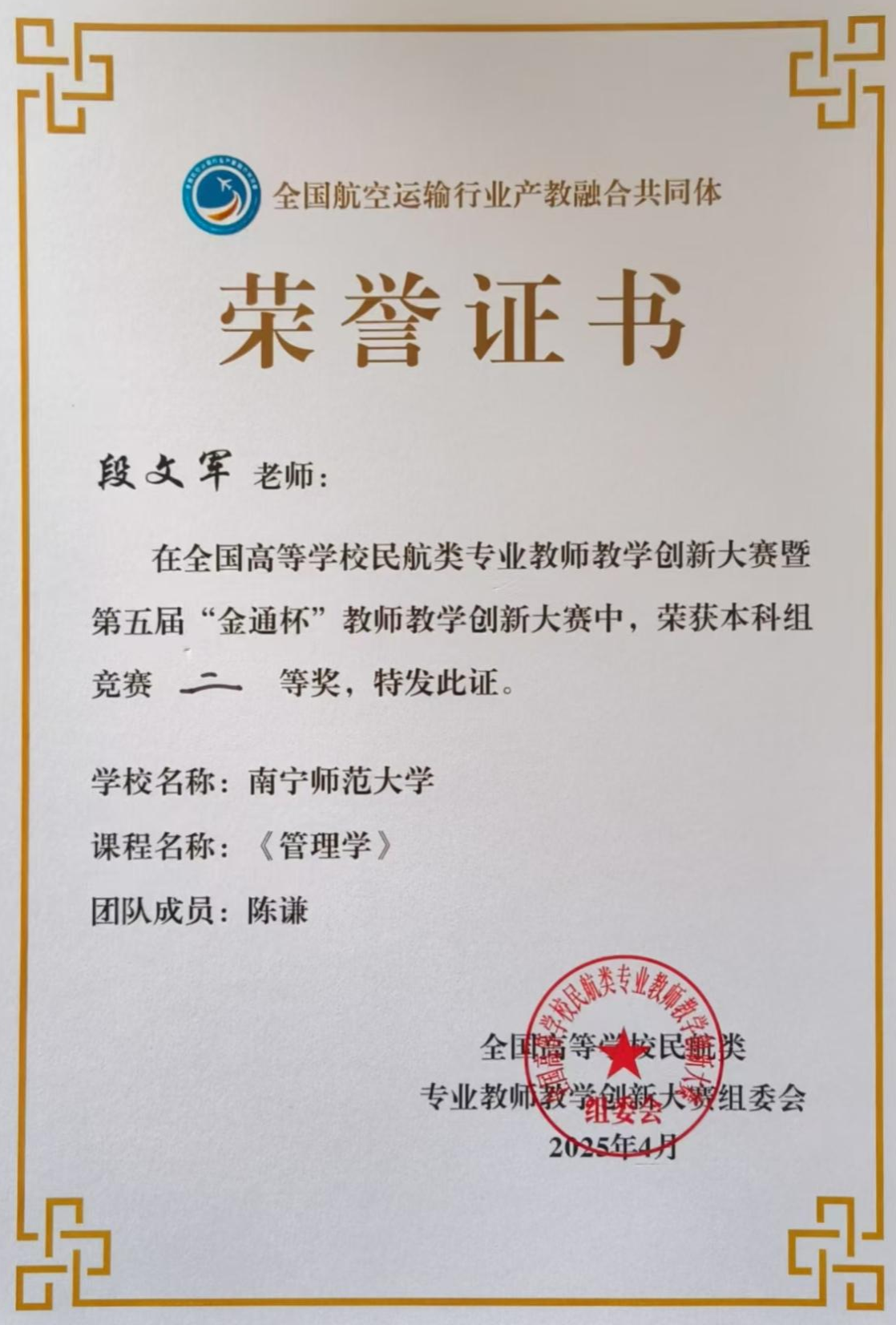 4月23日-25日,由中国交通教育研究会职业教育分会、全国航空运输行业产教融合共同体、北京广慧金通教育集团主办的全国高等学校民航类专业教师教学创新大赛暨第五届“金通杯”教师教学创新大赛决赛在山东曲阜举办。本次大赛包括本科、高职两条赛道,经过网络评审,层层选拔,全国共有31支优秀教师团队入围总决赛。在现场总决赛中,beat365官网派出的旅游与文化学院段文军、陈谦老师团队荣获本科组二等奖。