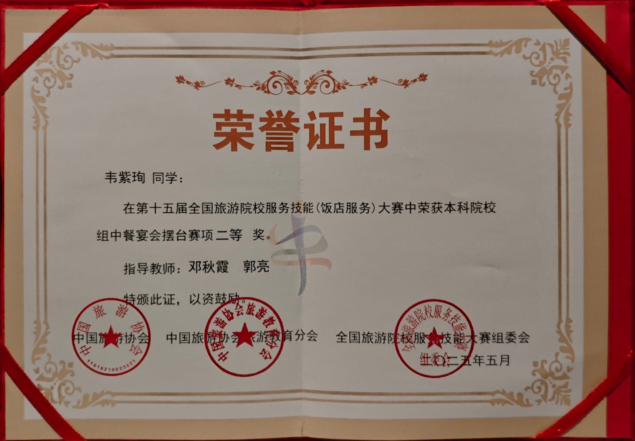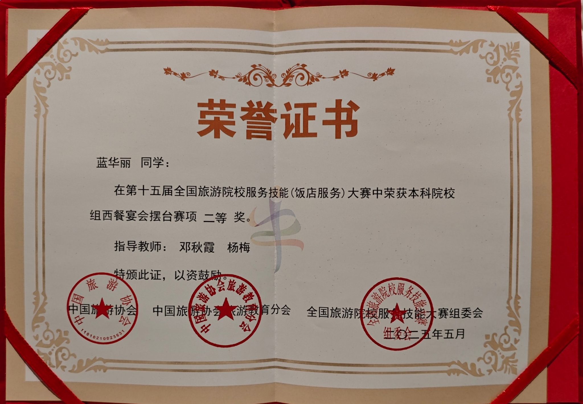 5月14日至18日,在郑州举办的第十五届全国旅游院校服务技能(饭店服务)大赛中,beat365官网旅游与文化学院的3位参赛选手凭借卓越表现脱颖而出。其中,蓝华丽同学在本科院校组西餐宴会摆台赛项中荣获二等奖,韦紫珣同学在本科院校组中餐宴会摆台赛项中斩获二等奖,吴俊松同学在本科院校组客房服务赛项中获得三等奖。