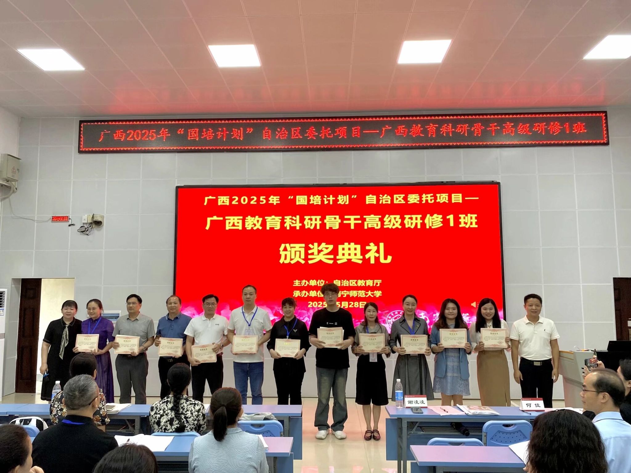 自治区教育厅高度关注此次研修活动,广西教育研究院院长谢凌凌出席了结业典礼并听取学员的成果汇报。在总结致辞中,他对学员们顺利完成研修表示祝贺,希望他们发挥示范引领作用,带动区域教育科研水平提升,书写广西教育高质量发展的奋进答卷。