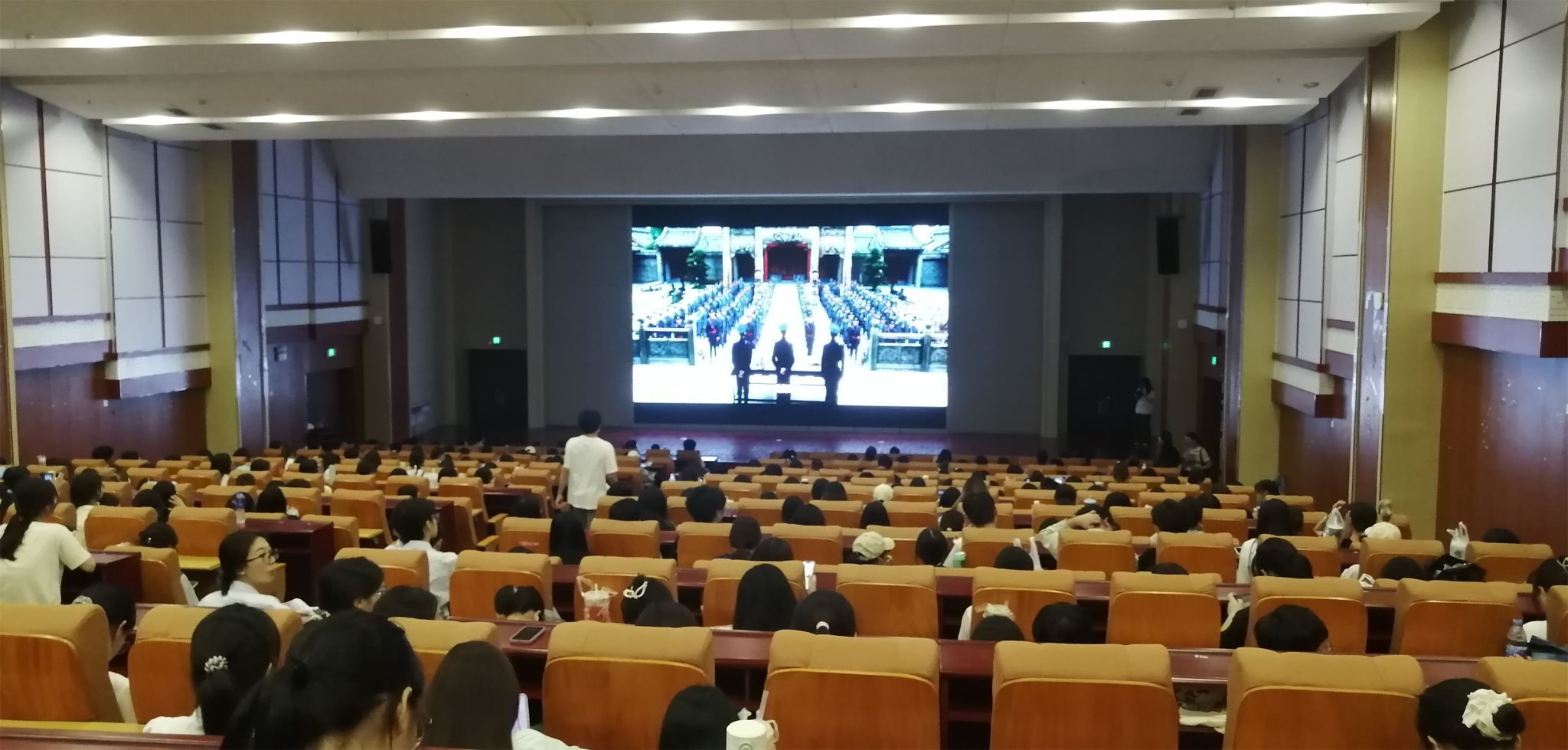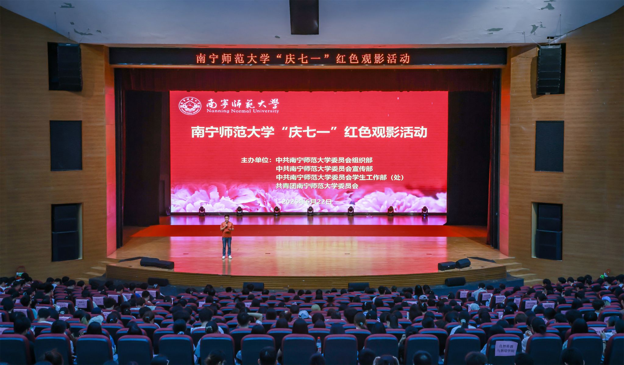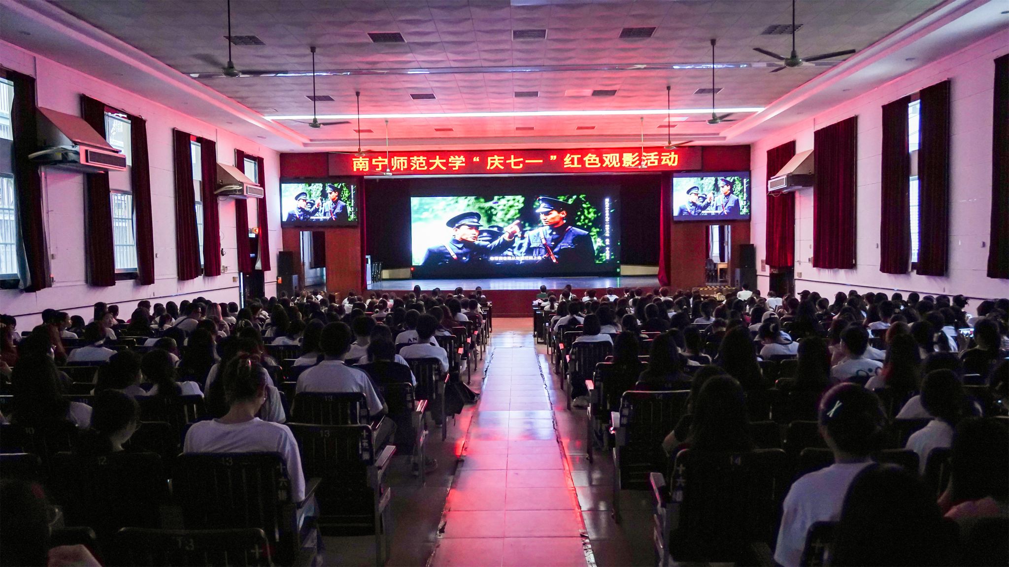 为庆祝中国共产党成立104周年,beat365官网在武鸣、五合、明秀三个校区同时开展“庆七一”红色观影活动。学校纪委书记李美清,学校相关职能部门负责人及老师,与来自各学院共2000余名师生一同观看了红色主旋律电影《一生交给党》。