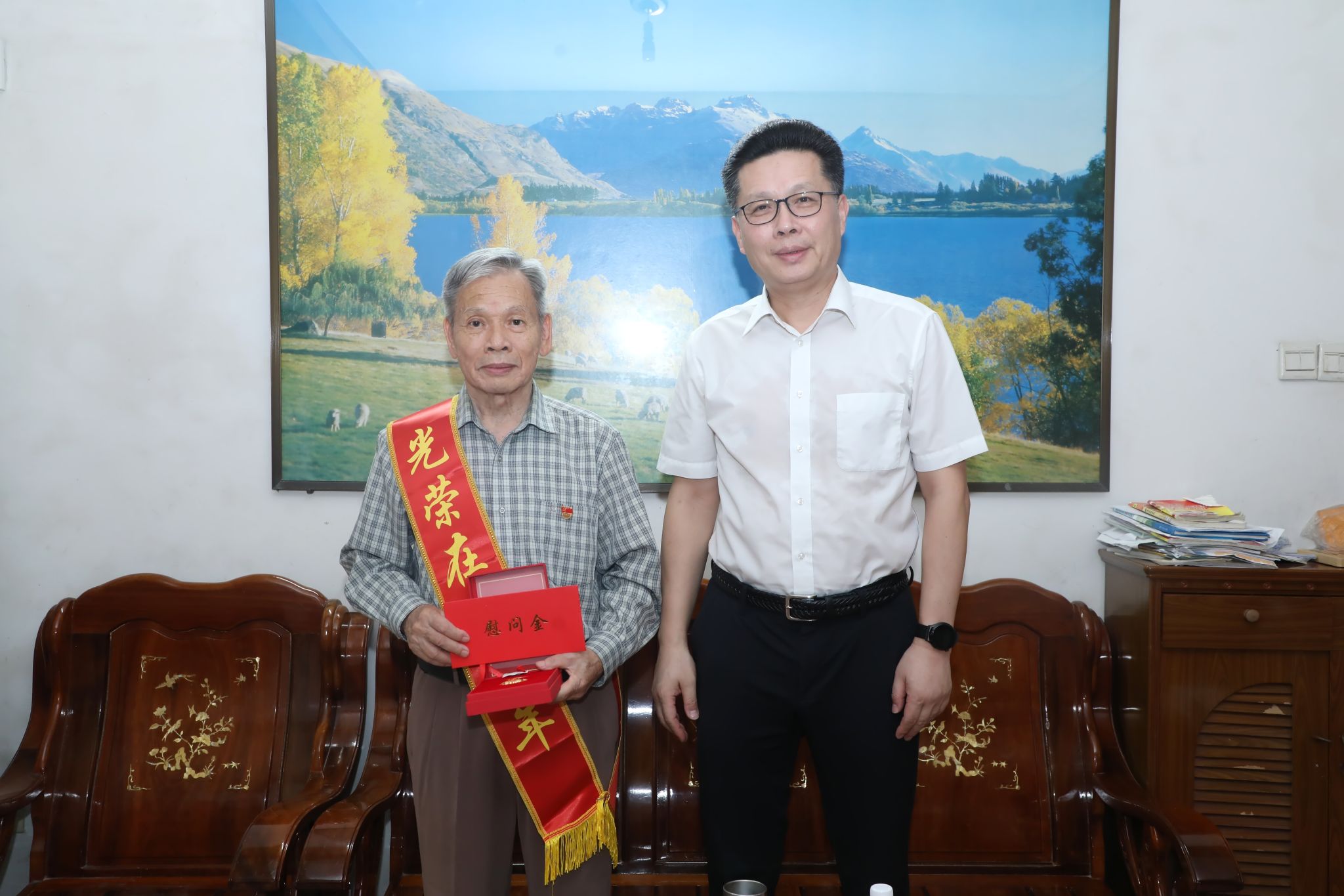 学校领导一行看望慰问了离休老干部代表薛碧芳、“光荣在党50年”党员代表李佳秋、任北上、韦春尧、杨思红、陆维杰、苏绍云,以及生活困难党员代表李福洲、梁冠超、郑卫华,为他们送上慰问金,颁发“光荣在党50年”纪念章。学校领导与离退休老同志亲切交谈,关心询问他们的身体状况、生活需求,感谢他们长期以来为党的教育事业和学校建设发展所作出的贡献,希望老党员们在保重身体、安享晚年的同时,一如既往地关心支持学校各项工作,继续为学校高质量发展积极建言献策。