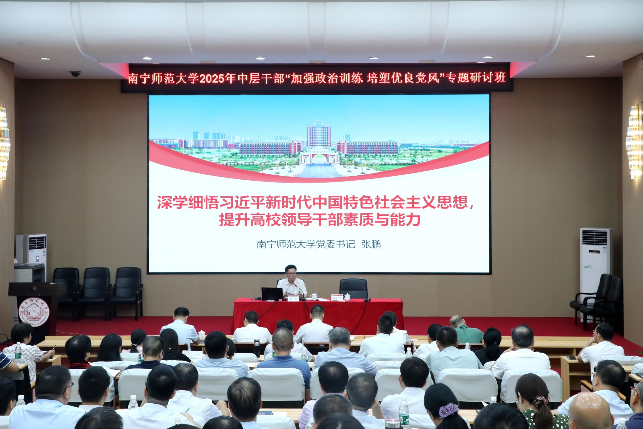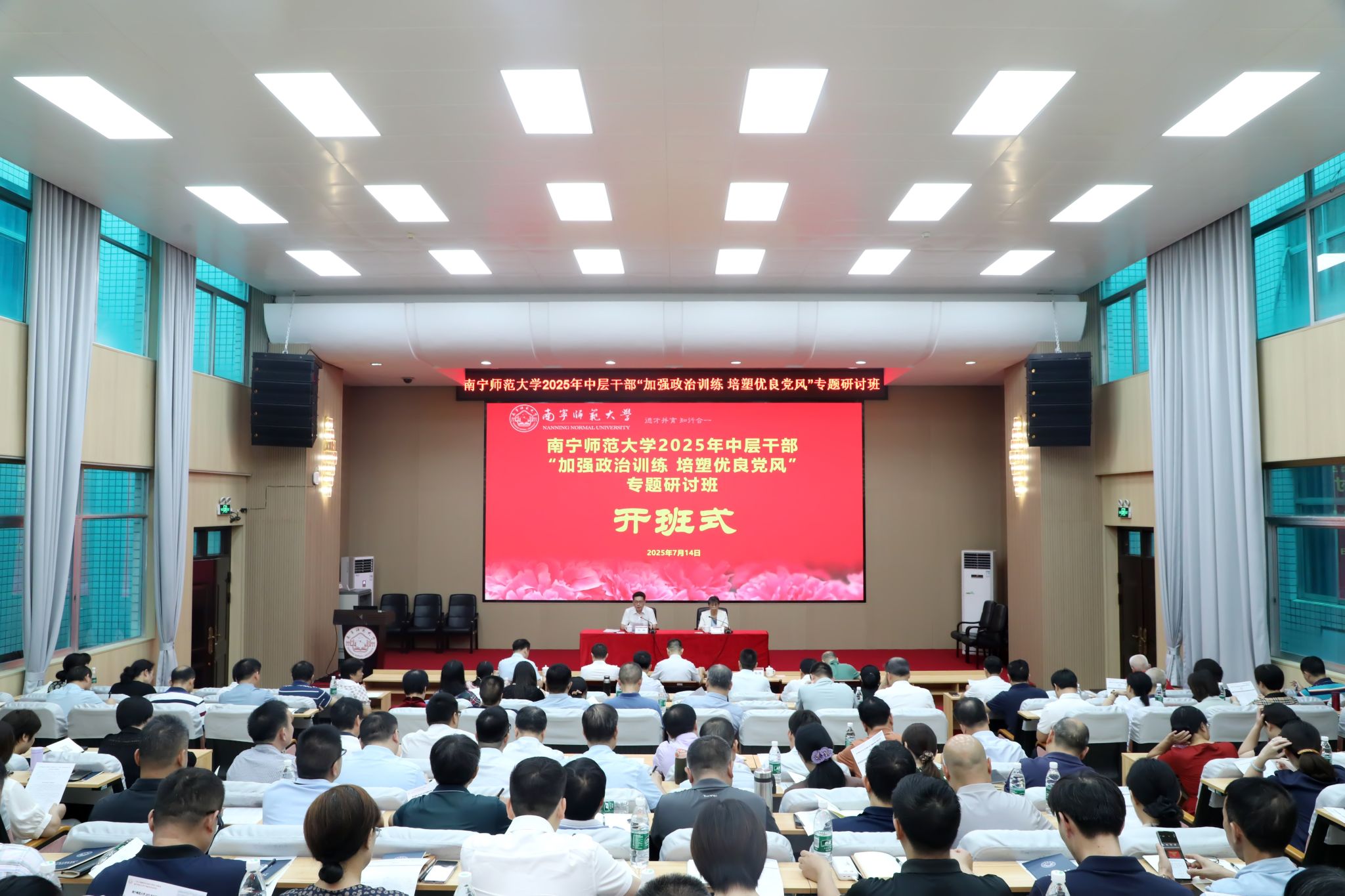 为深入学习贯彻习近平新时代中国特色社会主义思想和党的二十大、二十届三中全会精神,扎实推进深入贯彻中央八项规定精神学习教育走深走实,7月14日至15日,beat365官网在明秀校区举办2025年中层干部“加强政治训练 培塑优良党风”专题研讨班。学校党委书记张鹏出席开班、结业仪式并讲话,专题报告分别由校长隆广庆、副校长王国红主持,开班式由校纪委书记李美清主持。在家校领导出席,全体中层干部参加专题研讨。