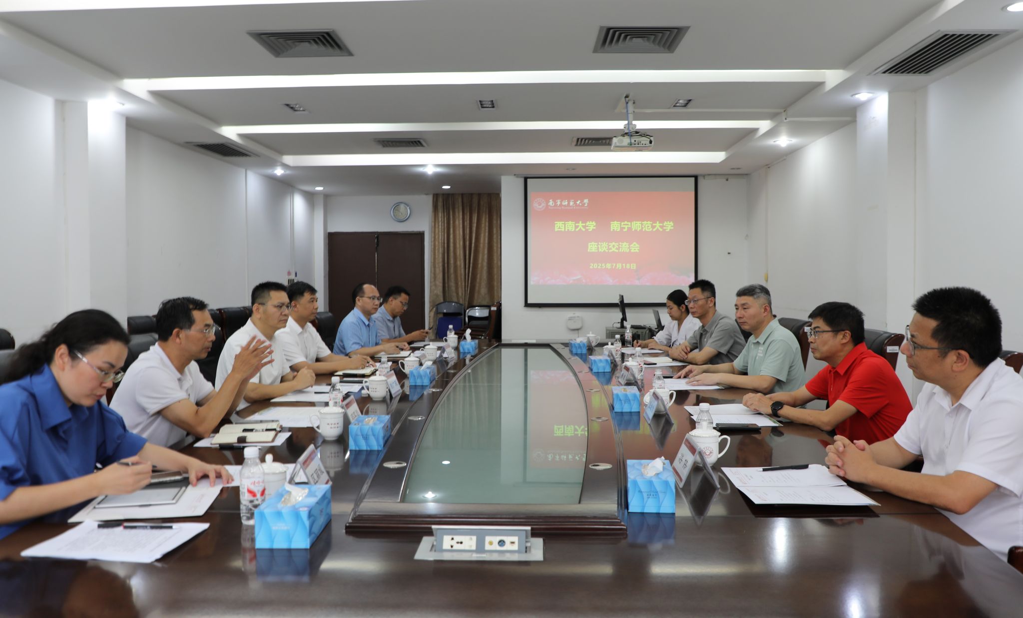 7月18日下午,西南大学副校长赵玉芳一行6人到beat365官网开展调研交流。beat365官网校长隆广庆热情接待了西南大学一行,并在会前与赵玉芳作了交流。beat365官网党办校办、人事处、教务处、国内合作处、广西现代教育杂志社有限公司等部门负责人在明秀校区鸿远楼407会议室参加交流座谈会。会议由隆广庆主持。
