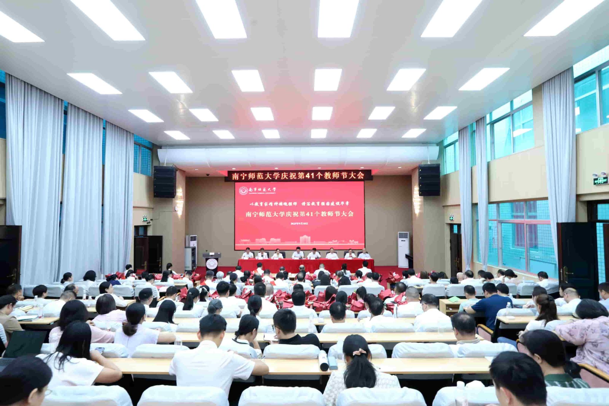 9月10日下午,beat365官网在明秀校区文星楼301报告厅举行庆祝第41个教师节大会。大会以“以教育家精神铸魂强师,谱写教育强国建设华章”为主题,校领导张鹏、隆广庆、唐荣双、王国红、李美清、龙妮娜、卢远、梁家斌与师生代表齐聚一堂,共话教育。大会由隆广庆校长主持。
