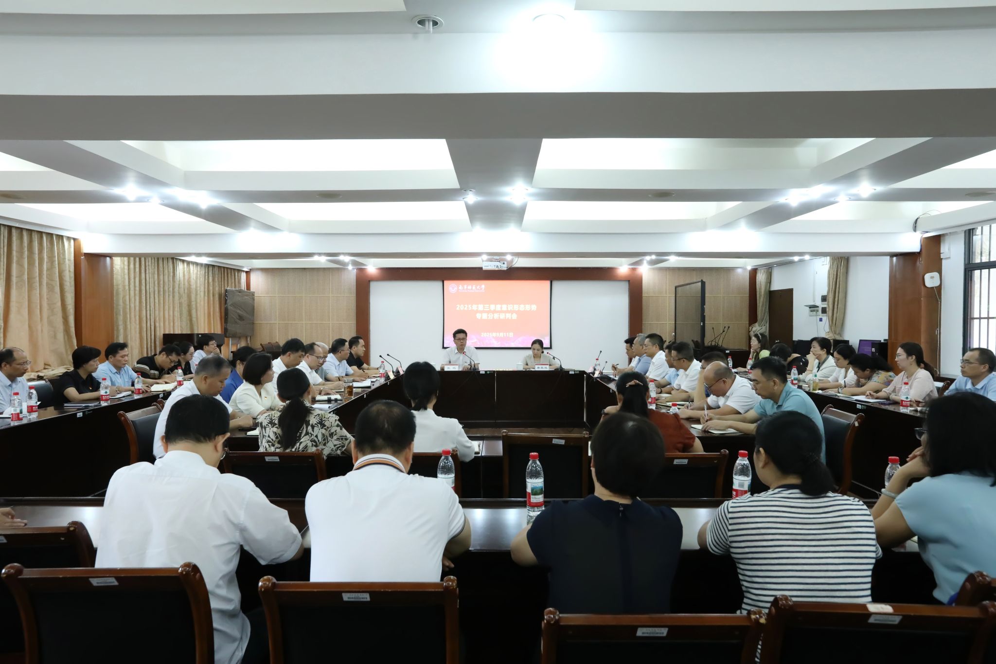 9月11日上午,beat365官网在明秀校区鸿远楼409会议室召开2025年第三季度意识形态形势专题分析研判会,传达学习近期上级关于意识形态工作的相关文件精神,分析研判学校近期意识形态形势并部署新学期意识形态各项工作。学校党委书记张鹏出席会议并讲话,党委副书记唐荣双主持会议。