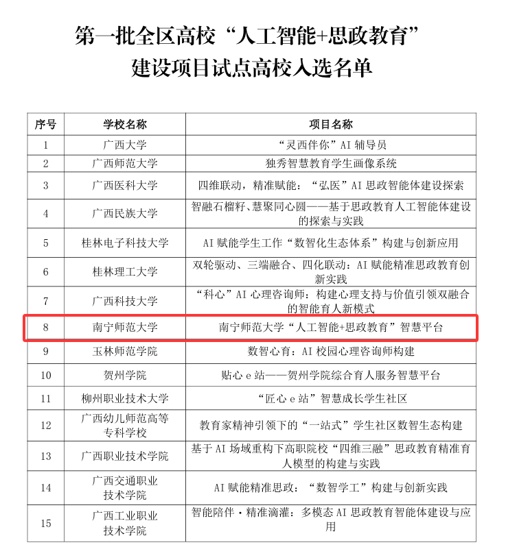 近日,广西壮族自治区教育厅公布第一批全区高校“人工智能+思政教育”建设项目试点高校名单,beat365官网成功获批首批试点高校,标志着学校在“人工智能+思政”融合探索方面迈出重要一步。