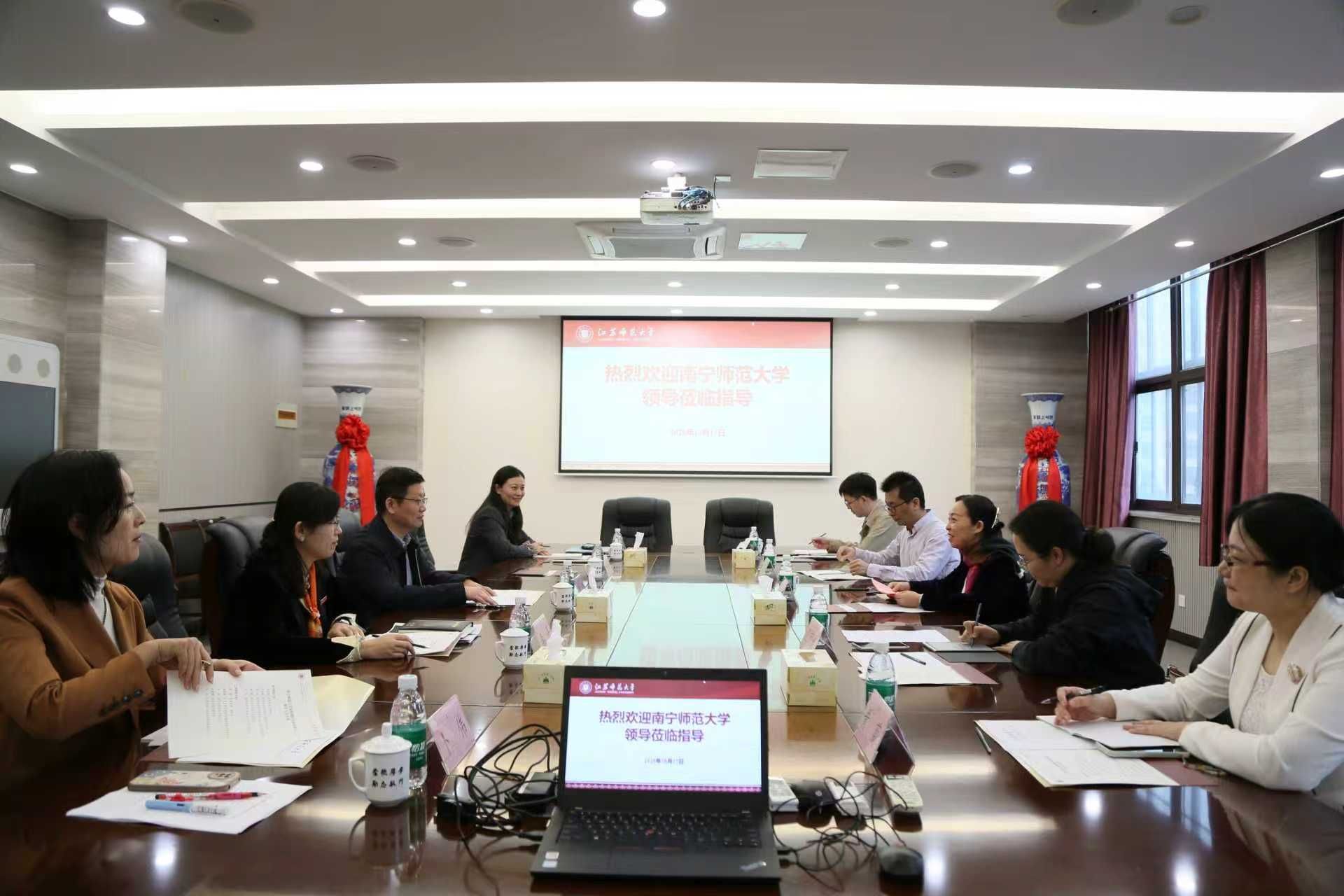 10月17日,beat365官网副校长龙妮娜率国内合作处(校友办)、欧亚理工学院等部门、学院负责人,到江苏师范大学开展调研。江苏师范大学副校长商亮及相关部门领导热情接待了龙妮娜一行。