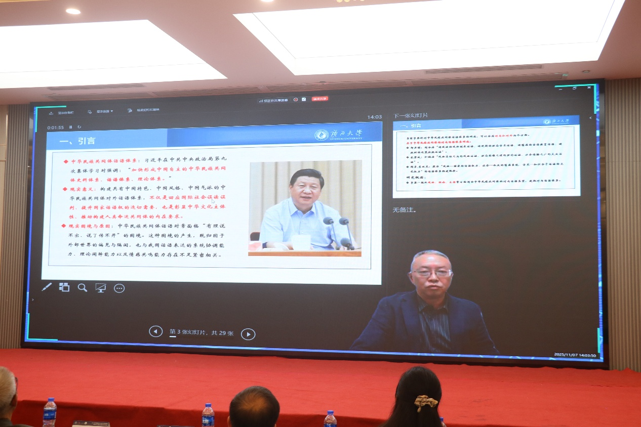 此次论坛共设有7场主旨报告和8个平行分论坛,主旨报告由新闻与传播学院院长梁颖涛教授主持。在主旨报告环节,郑保卫教授、赵曙光教授以及复旦大学新闻学院廖圣清教授、中央民族大学新闻与传播学院副院长张垒教授、广西大学新闻与传播学院院长王仕勇教授、beat365平台官方网站新闻与传播学院副院长周飞伶教授、广西旅发元境文化旅游开发有限公司总经理王铭峰分别围绕民族边疆地区创新发展传播学、地方特色文化传播与铸牢中华民族共同体意识、在理论与实践的互构中加快形成自主的中华民族共同体话语体系、中华民族共同体对外传播的话语类型及其系统整合、边界与造境:非遗传播的问题与可能性、智媒添翼,非遗新生:AI 赋能非物质文化遗产的创新传播与实践探索等议题作主题报告。
