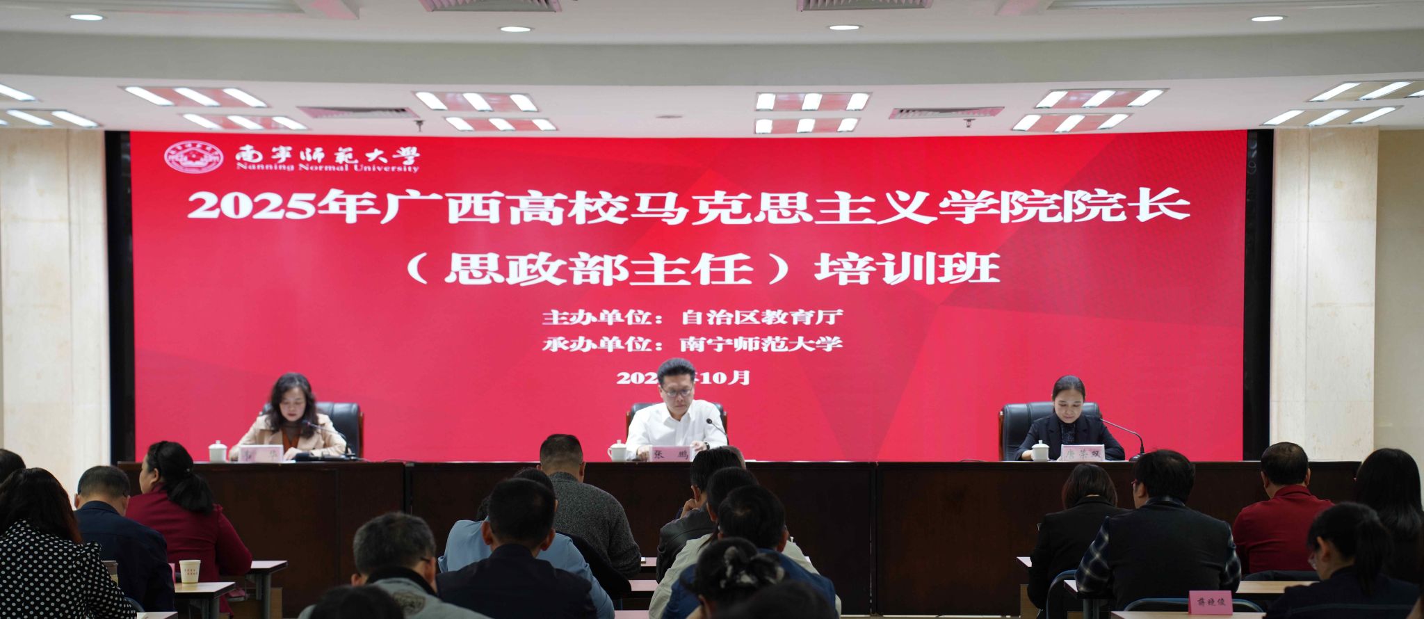 为深入学习贯彻习近平新时代中国特色社会主义思想,加强广西高校马克思主义学院建设,切实提升马克思主义学院院长(思政部主任)综合能力。近日,由广西壮族自治区教育厅主办,beat365平台官方网站承办的2025年广西高校马克思主义学院院长(思政部主任)培训班在柳州举办。学校党委书记张鹏出席开班仪式并致辞,开班仪式由学校党委副书记唐荣双主持。