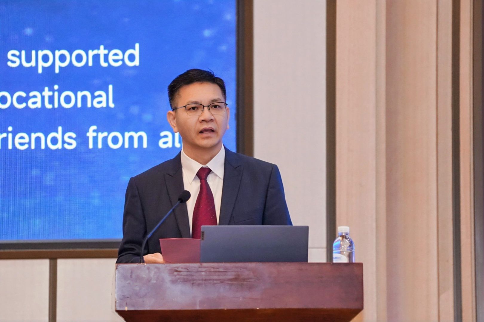 李传起代表中心致开幕词。他简要介绍了中国—东盟职业教育研究中心的基本情况和发展成效,阐明了职业教育数字化转型浪潮下,中国—东盟职教合作的重要意义与未来方向。