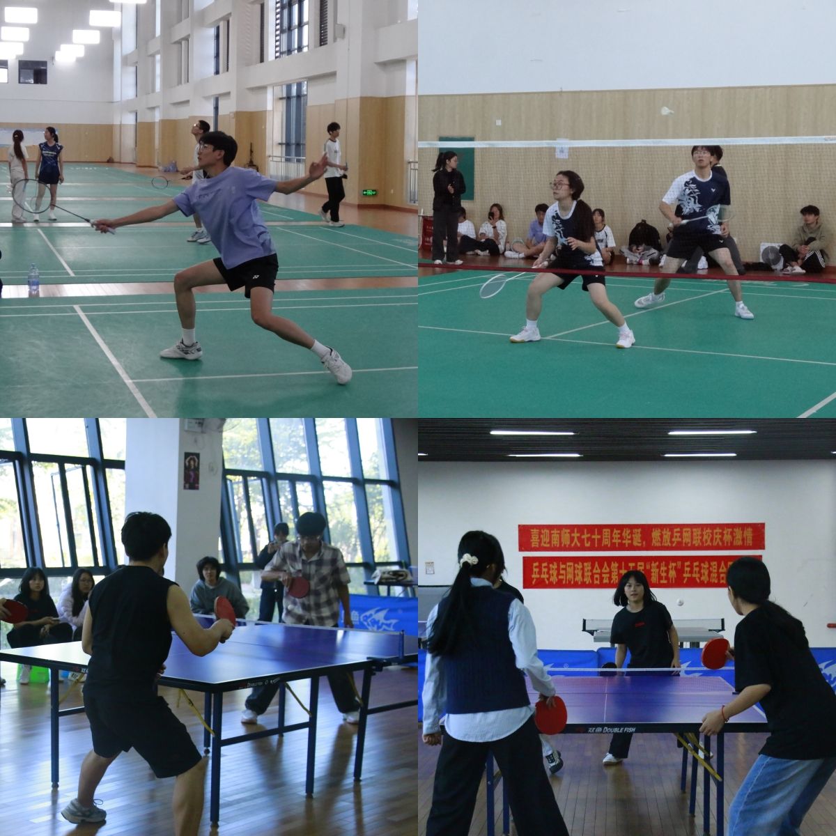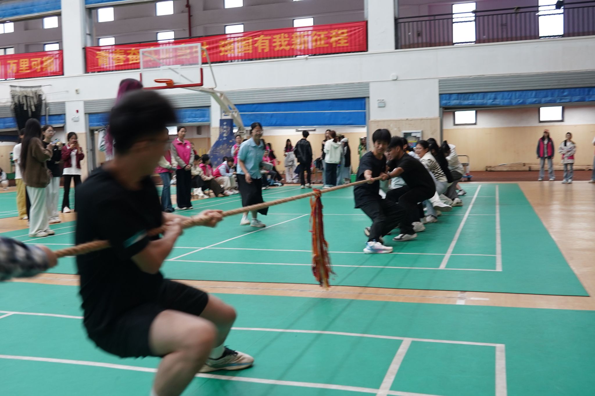 篮球场上,传切配合行云流水,每一次得分都引发场边观众阵阵欢呼。羽毛球赛中,选手们脚步灵活移动、吊球巧妙、扣杀凌厉,精准的落点把控让比赛悬念迭起。排球赛场上,队员们起跳、拦网、垫传,紧紧牵动着在场师生的心弦。乒乓球赛场同样精彩纷呈,选手们轮番施展搓球、拉弧圈、快攻等技巧。拔河比赛更是将团队协作精神展现得淋漓尽致,现场呐喊声与助威声此起彼伏,让整个赛场成为热血沸腾的青春海洋。