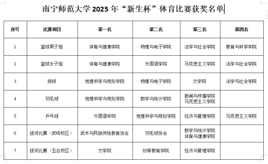 11月22日,赛事闭幕式暨颁奖仪式在武鸣校区松园体育馆举行,运动员及学院代表500余人齐聚现场,共同见证荣耀时刻。经过激烈角逐,体育与健康学院团队分别斩获篮球男子组和女子组冠军;地理科学与规划学院团队分别斩获排球和羽毛球比赛冠军;外国语学院团队斩获乒乓球比赛冠军,文学院和武术与民族传统教育协会分别斩获五合、武鸣校区拔河比赛冠军。校团委副书记为获奖队伍颁发奖杯与锦旗,同时对全体参赛选手的辛勤付出与顽强拼搏给予高度肯定,勉励青年学子将赛场上的坚韧意志与协作精神,转化为学习求知、成长进步的动力,争做积极向上、健康活力的新时代青年。