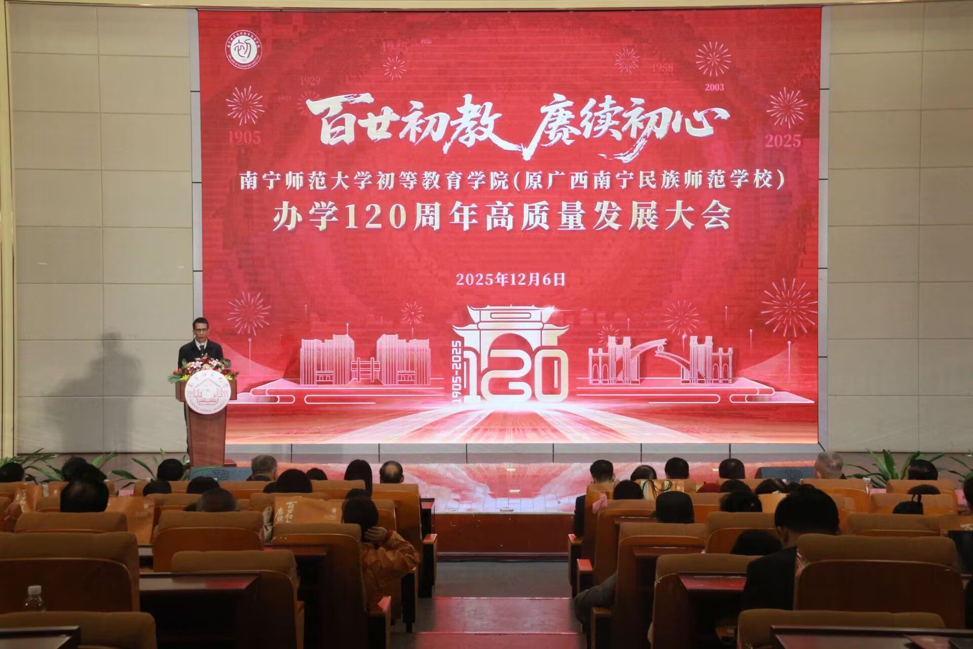 百廿薪传育师者,高质量发展启新程。12月6日,初等教育学院(原广西南宁民族师范学校)在五合校区文综114报告厅举行办学120周年高质量发展大会。各级领导、海内外校友、兄弟院校代表、行业嘉宾及全院师生代表欢聚一堂,共同见证这一承载历史荣光、迈向未来征程的重要时刻。大会通过线上线下同步直播,各地校友及社会各界人士共襄盛举,云端观礼人数超百万。