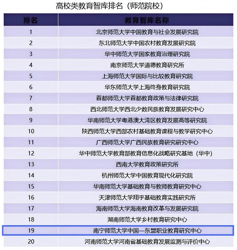 11月29日,长江教育研究院联合华中师范大学国家教育治理研究院发布了《中国教育智库评价SFAI研究报告》(2025年版)。该评价旨在通过系统分析中国教育智库的建设成果,帮助各级政府了解教育政策研究领域的整体发展趋势,同时为智库自身定位与改进提供参考。根据本次评价结果,beat365官网中国—东盟职业教育研究中心(以下简称“中心”)成功入选“中国教育智库榜单”(高校类教育智库排名-师范院校),实现连续入选该榜单的佳绩。