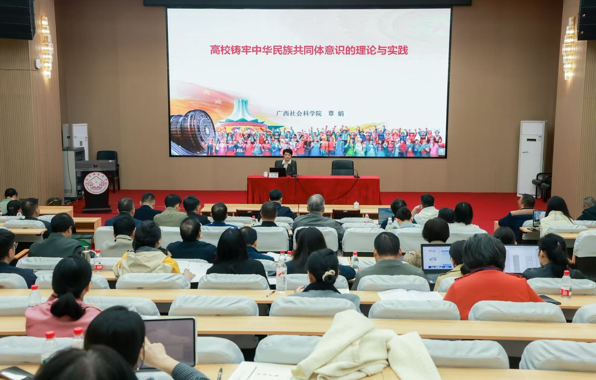 吴汉时以《紧紧围绕铸牢中华民族共同体意识主线,发挥高校优势促进各民族广泛交往交流交融》为题深入解读党中央决策部署,并就高校如何发挥优势,把握“四种关系”、深化“四个与共”“五个认同”教育提出具体指导。覃娟以《高校铸牢中华民族共同体意识的理论与实践》为题,系统阐释了新时代民族工作的重大意义和实践路径。