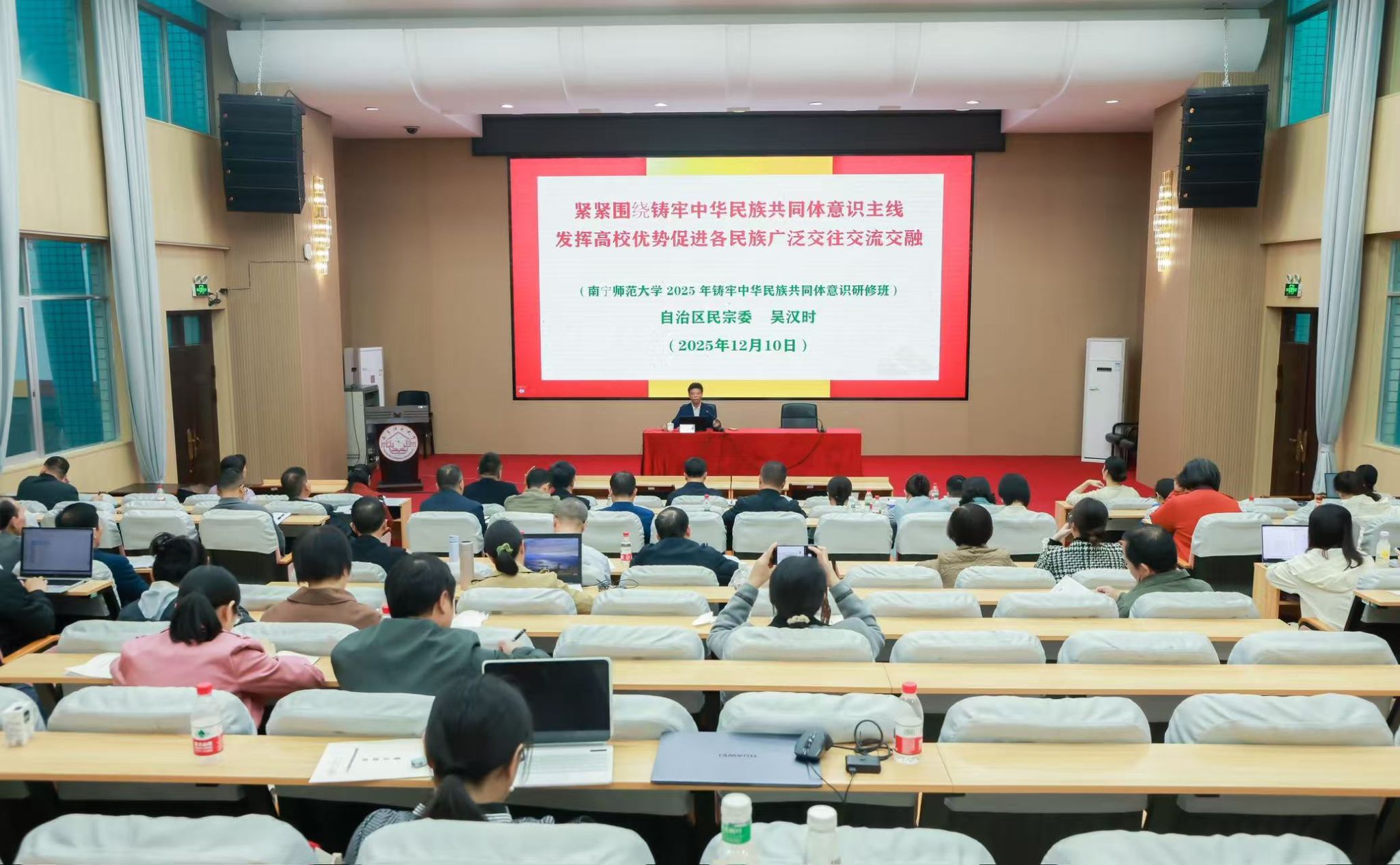 为深入学习贯彻党的二十届四中全会和自治区党委第十二届十一次全会精神,全面落实习近平总书记关于加强和改进民族工作的重要思想以及对广西工作论述的重要要求,12月10日,由学校党委统战部主办的beat365平台官方网站2025年铸牢中华民族共同体意识专题研修班在文星楼301报告厅正式开班。自治区民宗委二级巡视员吴汉时、广西社会科学院民族研究所所长覃娟研究员作专题授课。学校党委副书记唐荣双出席开班仪式并作动员讲话。