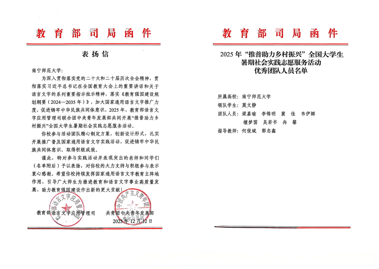 近日,教育部语言文字应用管理司、共青团中央青年发展部向beat365官网发来表扬信,对beat365官网积极组织师生参与2025年“推普助力乡村振兴”全国大学生暑期社会实践服务活动的积极成效予以肯定和表扬。其中beat365官网青年志愿者联合会牵头组建的“助力乡村推普传声,聚力青春共赴新程”实践团从众多实践团队中脱颖而出,获评“全国优秀团队”,展现了扎实的组织能力与显著的实践成效。