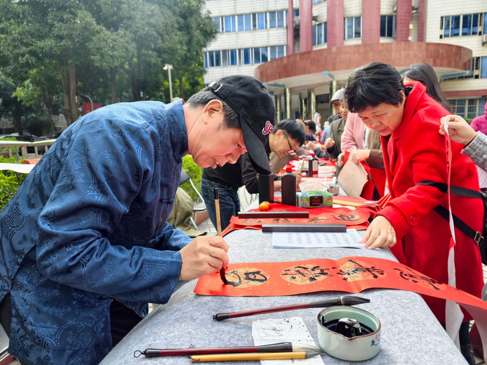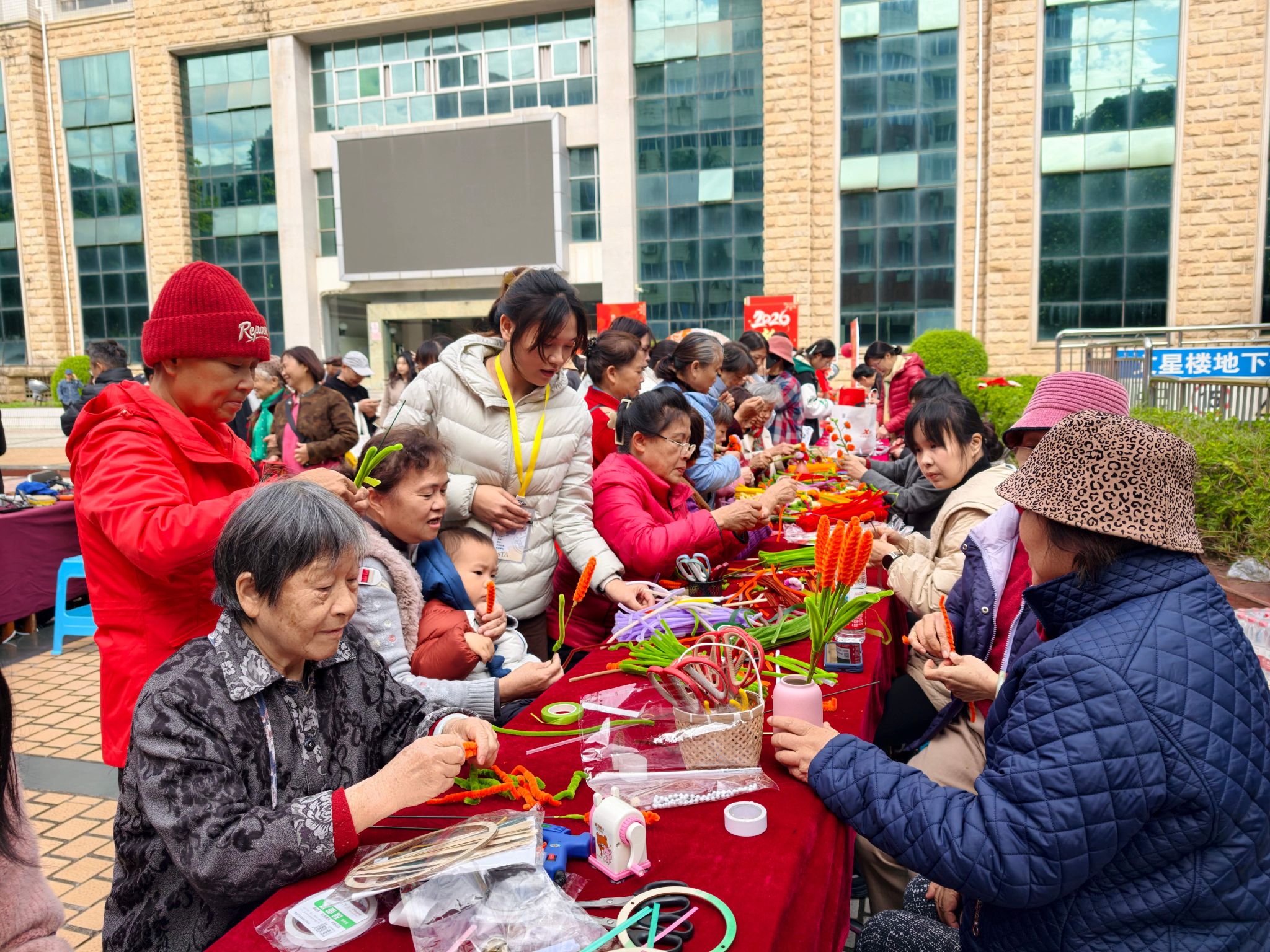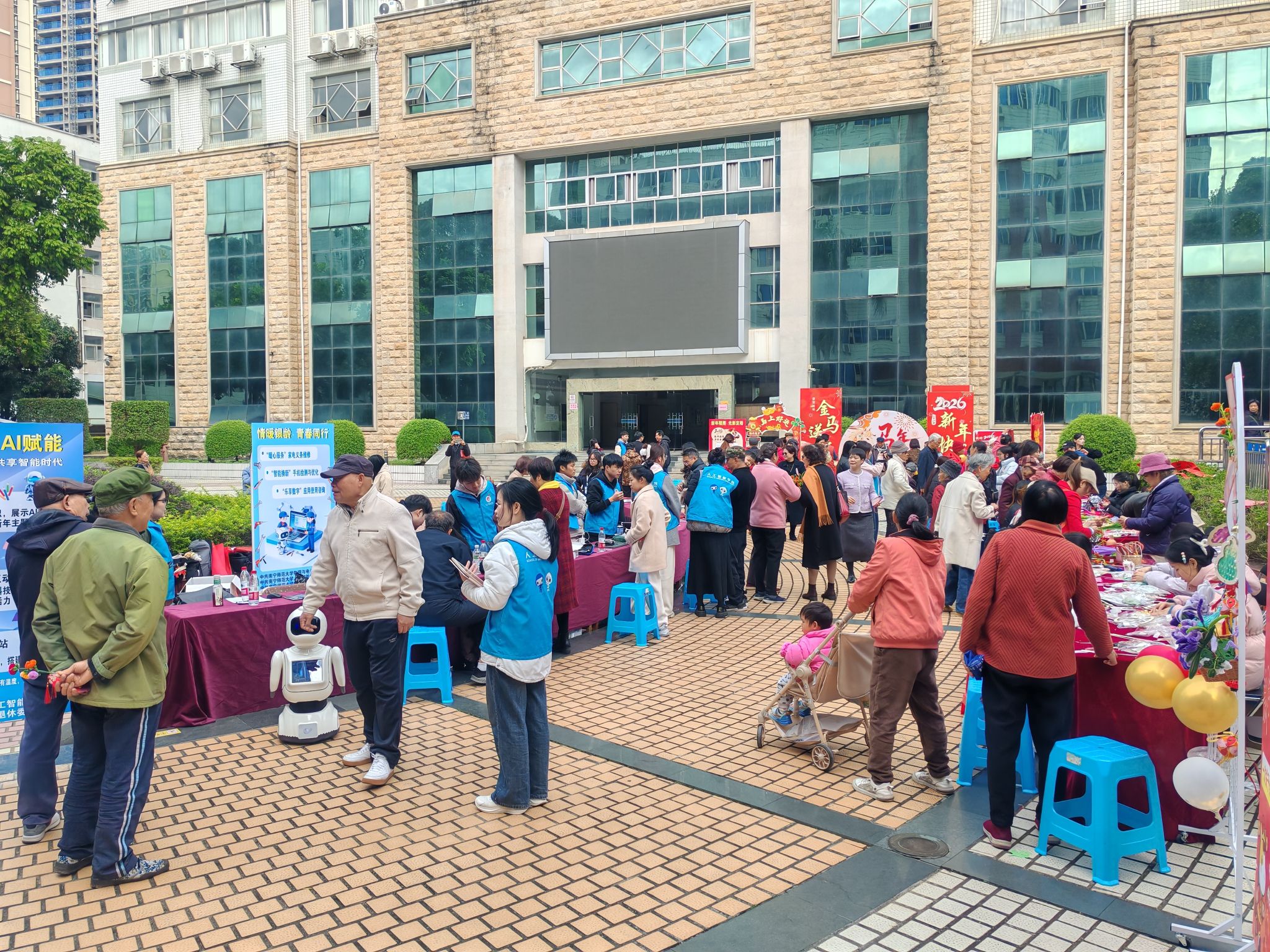 活动现场,气氛热烈。活动以“党建引领+文化传承+科技体验+志愿服务”为主线,精心设置了写春联送祝福、拍摄新年“福”照、AI艺术创作、AI机器人互动、家电义务维修、趣玩非遗手工(非遗剪纸、竹编风玲、创意扭扭棒)等六大主题专区,吸引了众多离退休老同志和青年师生共同参与,通过沉浸式互动展现老少共融、代际传承的校园文化新气象。
