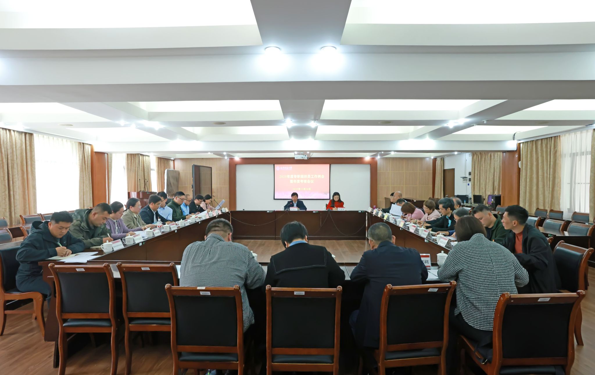 12月30日,学校在明秀校区鸿远楼409会议室召开2025年度专职组织员工作例会暨年度考核会议。
