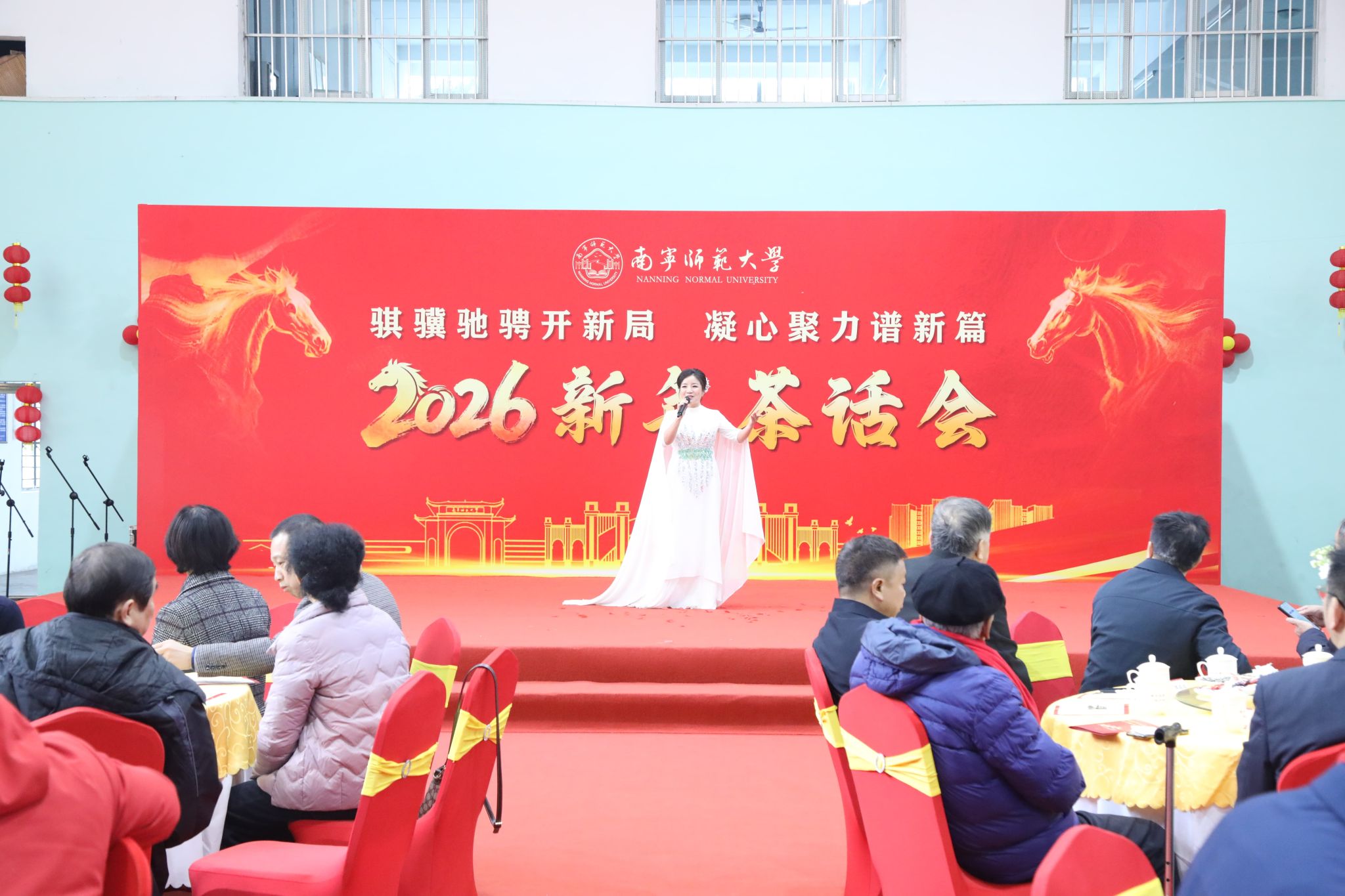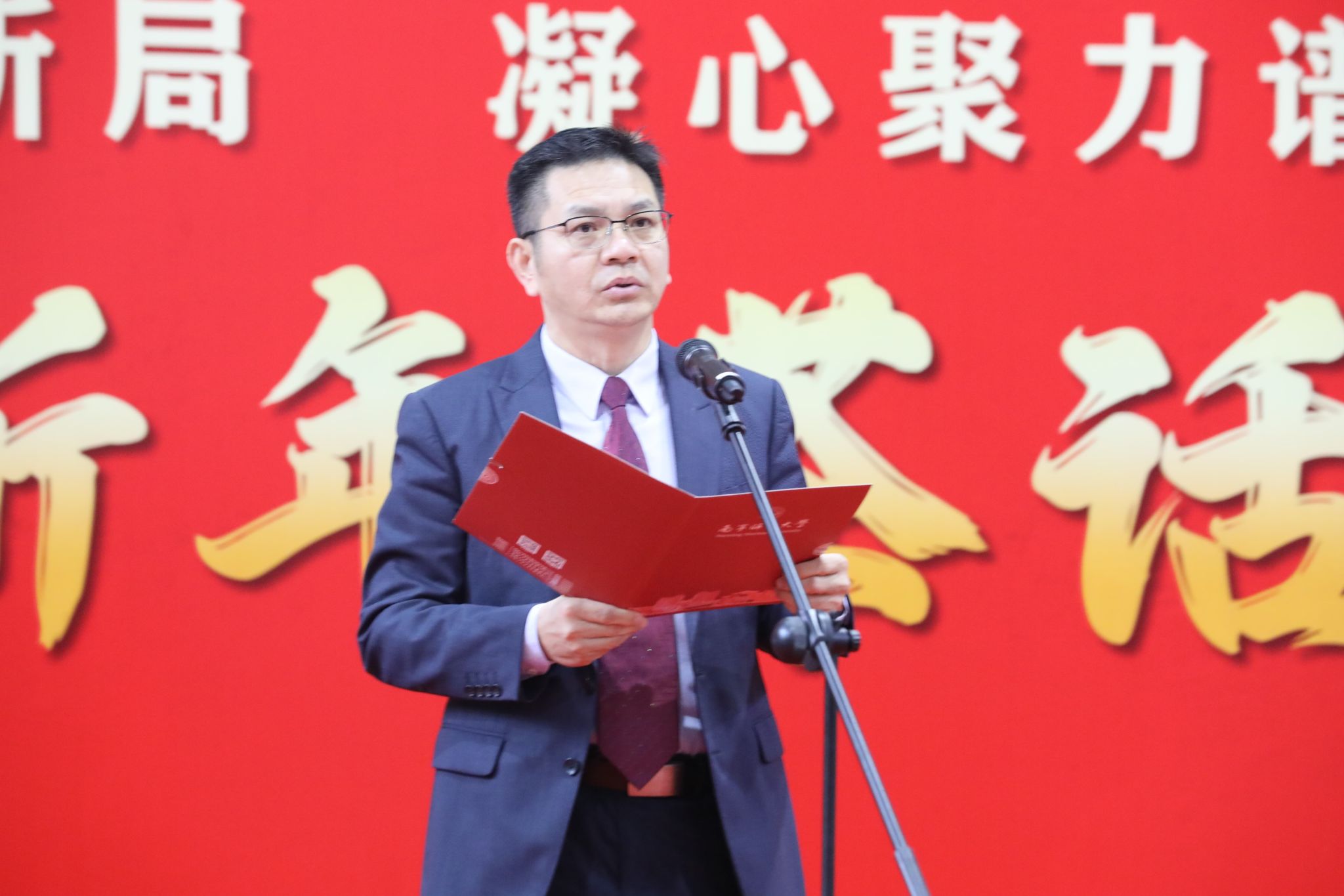 校党委书记张鹏代表学校党委,向各位老领导、老同志、民主党派和无党派人士、全校师生员工、广大校友以及关心支持学校发展的社会各界朋友们,致以诚挚的祝福和崇高的敬意。他指出,2025年是学校发展史上极具里程碑意义的一年。我们坚持以习近平新时代中国特色社会主义思想为指导,深入贯彻党的二十届四中全会精神及党中央和自治区党委决策部署,团结带领全校师生深化改革、接续奋斗,圆满完成“十四五”规划收官任务,推动学校高质量发展迈出坚实步伐。他强调,2026年是“十五五”规划开局之年,也是学校实现高质量发展的关键之年。学校将继续坚持和加强党的全面领导,全力推进“十五五”规划落地实施,真抓实干、乘势而上,为建成教师教育特色鲜明的高水平师范大学、服务广西经济社会发展作出新的更大贡献。