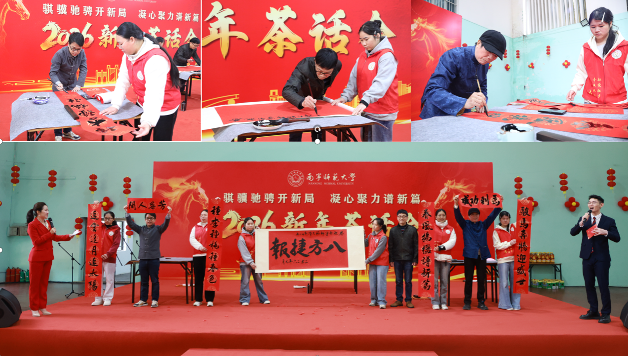 茶话会期间,师生代表表演了歌曲、朗诵、舞蹈、书法等精彩节目,展现学校蓬勃向上的精神风貌,凝聚了团结奋进的磅礴力量。音乐与舞蹈学院教师龙榕宇、刘俊纬带来男女对唱《春风十万里》奏响前行号角,文学院教师王毅、朱冬夏、刘基伟、陈亚飞深情朗诵《春风与荣光——致beat365平台官方网站的明天》,音乐与舞蹈学院齐晨雨带来国风拉丁《西楼别序》,来自国际教育学院的佳音(印度)、张林金(老挝)、云苏锦(柬埔寨)、李辉(泰国)等留学生代表用流利中文朗诵《中国话》,音乐与舞蹈学院舒春秀老师独唱《祖国你好》,来自离退休教职工服务中心、初等教育学院的张巧平、管义怀、钟勇等老师书法展示《春联送福》送上美好祝愿。离退休老同志还亲笔书写了百余张福字,将满满的祝福送到现场参会人员手中。互动抽奖环节更是将现场气氛推向高潮,精选自帮扶乡村的特色礼品让大家收获了满满的惊喜与欢乐。