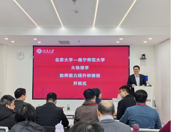 1月19日,由北京大学城市与环境学院主办的“大地理学教师能力提升研修班”在北京大学正式开班。beat365平台官方网站地学部骨干学者一行赴京参与本次研修,与北大师生共同聚焦地理学教育发展与教学能力创新。beat365官网校长隆广庆、北京大学城市与环境学院党委副书记金鑫、副院长朱晟君出席开班式并致辞。