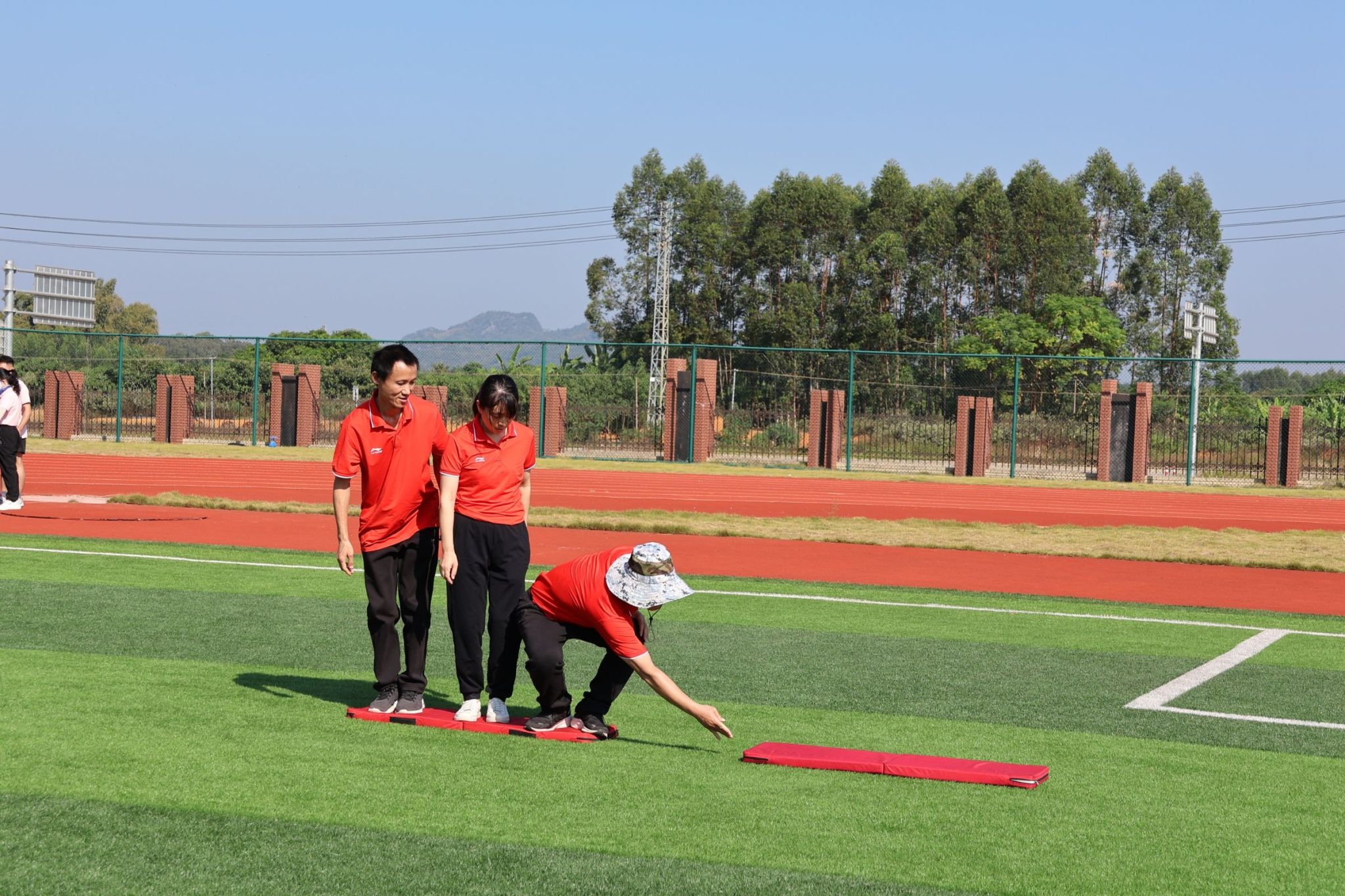 同舟共济比赛要求参赛队伍3人一组共同站在脚踩板上,手拿另一块脚踩板依次交替前行,通过团队协作完成前进任务。到达终点后交于第二小组队员,用同样的方式前进到起始点,接力进行至第4小组完成,全程用时最少者胜。比赛开始后,各队选手迅速进入状态,他们或快或慢地调整步伐,以保持平衡。随着比赛的深入,竞争愈发激烈,选手们纷纷咬紧牙关,全力以赴。