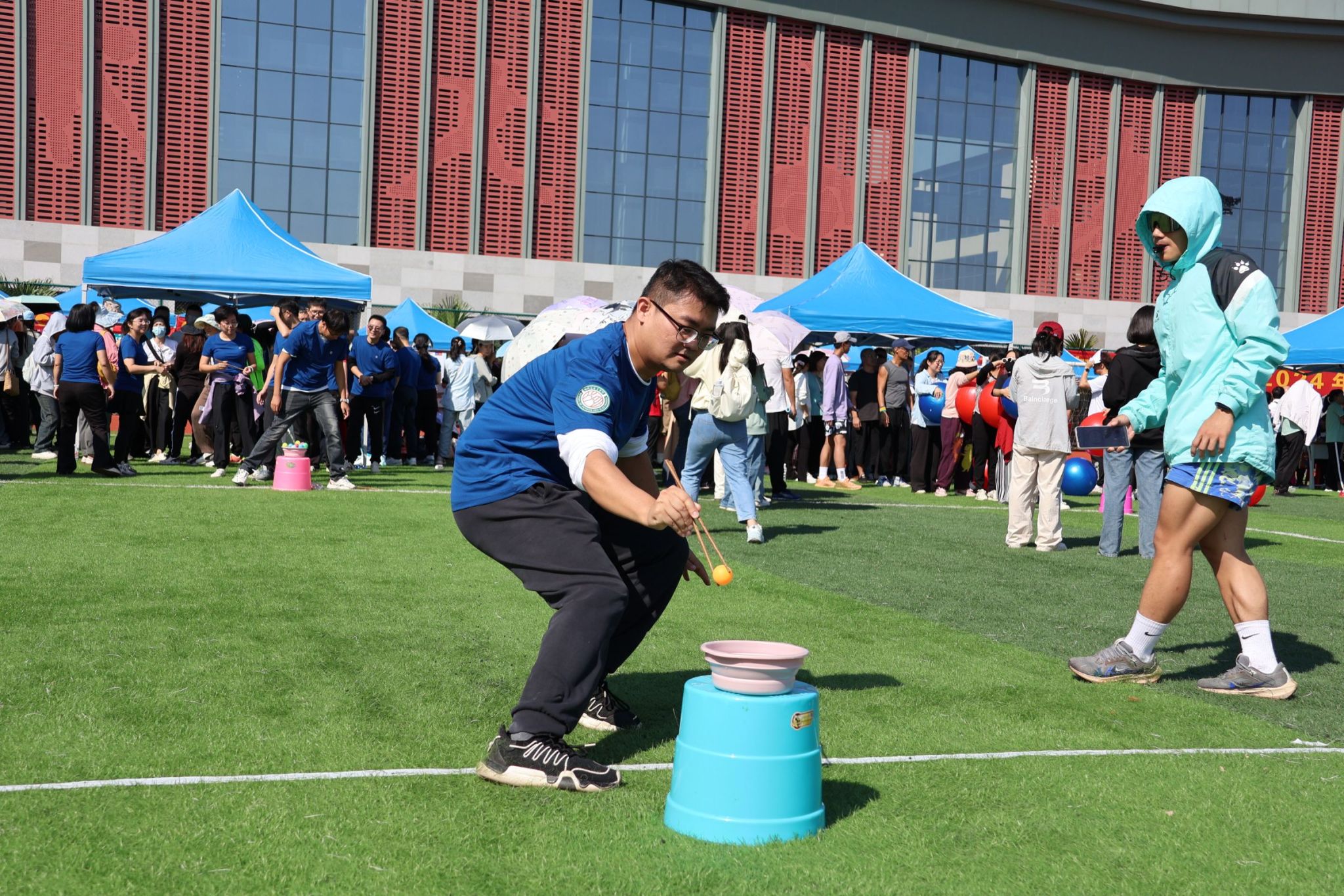 10月31日10时,beat365官网运动会教职工比赛项目之“筷子夹球”趣味运动在武鸣校区兰园体育场举行。