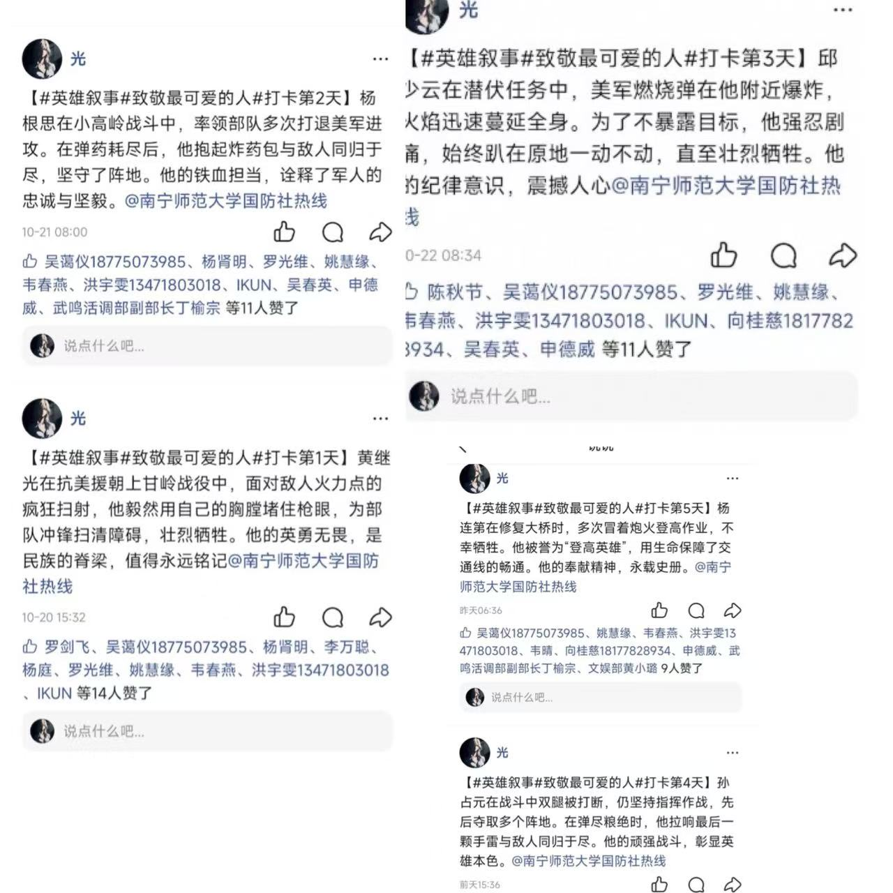 为缅怀抗美援朝先烈、传承伟大精神,10月20日至25日,beat365官网国防社面向全校在校学生开展“致敬最可爱的人”抗美援朝纪念日线上打卡活动,超千名学生参与其中。
