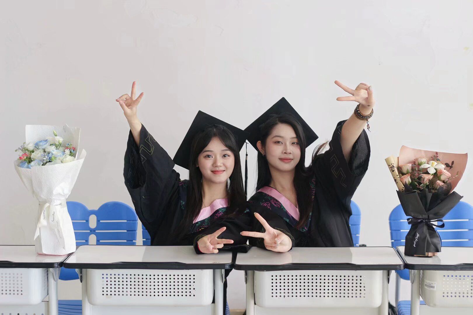 曾经,她们在此并肩而坐,聆听老师讲解时奋笔疾书记录重点,点头示意间流露理解;也曾为小组作业激烈讨论,各抒己见间碰撞出思想的火花。她们一会儿手捧鲜花,露出甜美的笑容,一会儿又一起搞怪,让相机记录下这些温馨又美好的瞬间。