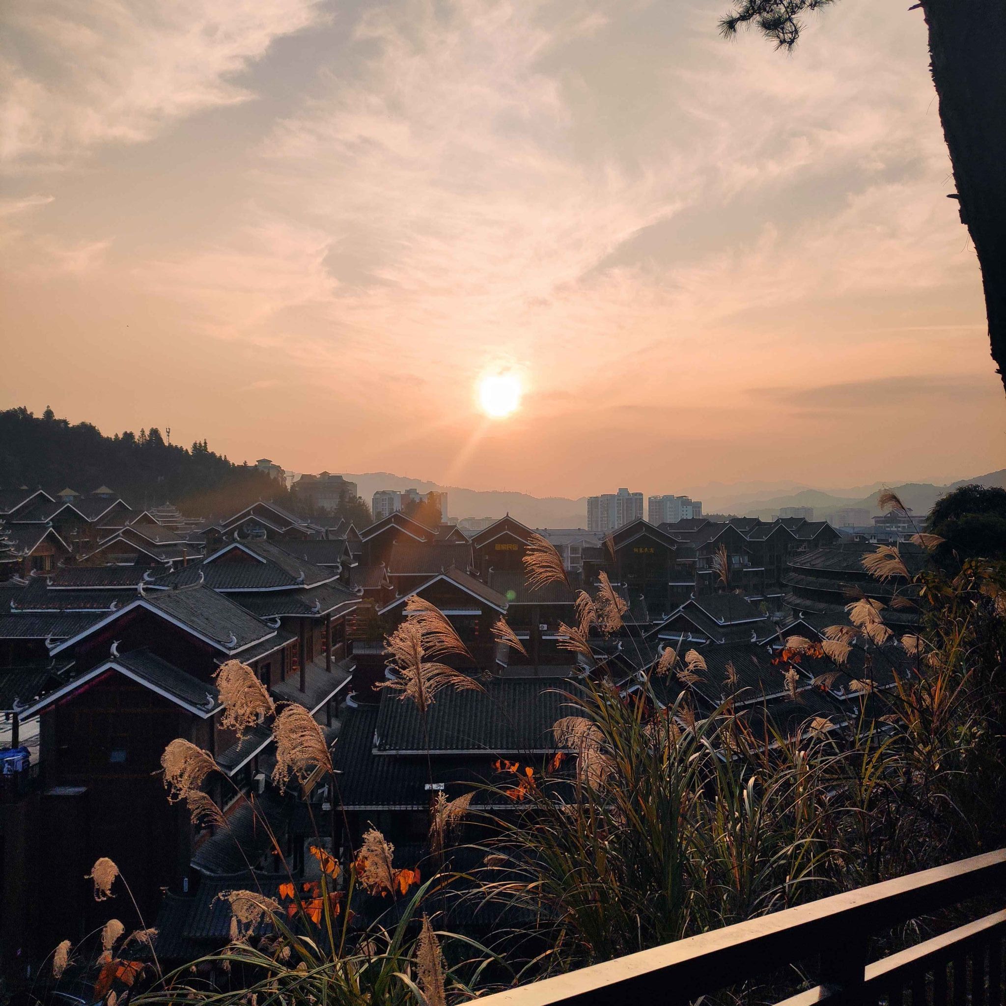 暮色霭霭,云日缠绵,壮族独特的干栏式建筑也在暮色里展露风情。
