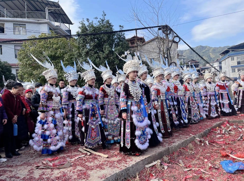 无银不花,不成姑娘,有衣无银,不成盛装。在大年初一或初二时,苗家姑娘身穿华丽鲜艳的苗族服饰欢聚一堂,一起唱苗歌、打糍粑、喝米酒、跳苗舞等,喜迎新年。