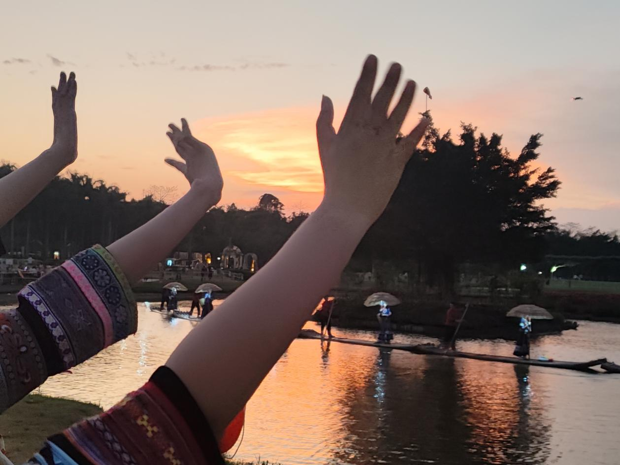 夕阳西下,水面波光粼粼,人们伸出手臂,似乎在热情地打招呼或表达喜悦。这或许是五一假期在景区河边的一幕。此时的自然景色与人文氛围交融,同学们在欣赏美丽夕阳的同时,也能感受当地的风土人情,放松身心,在大自然的怀抱中开启生活新章,享受悠闲惬意的时光。