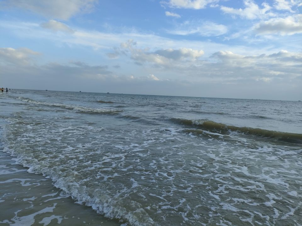 潮水退时留下镜面般的浅滩,湛蓝的海浪层层叠叠涌来,如同绸缎般起伏涌动。浪尖卷起晶莹的浪花,与天空融为一体。