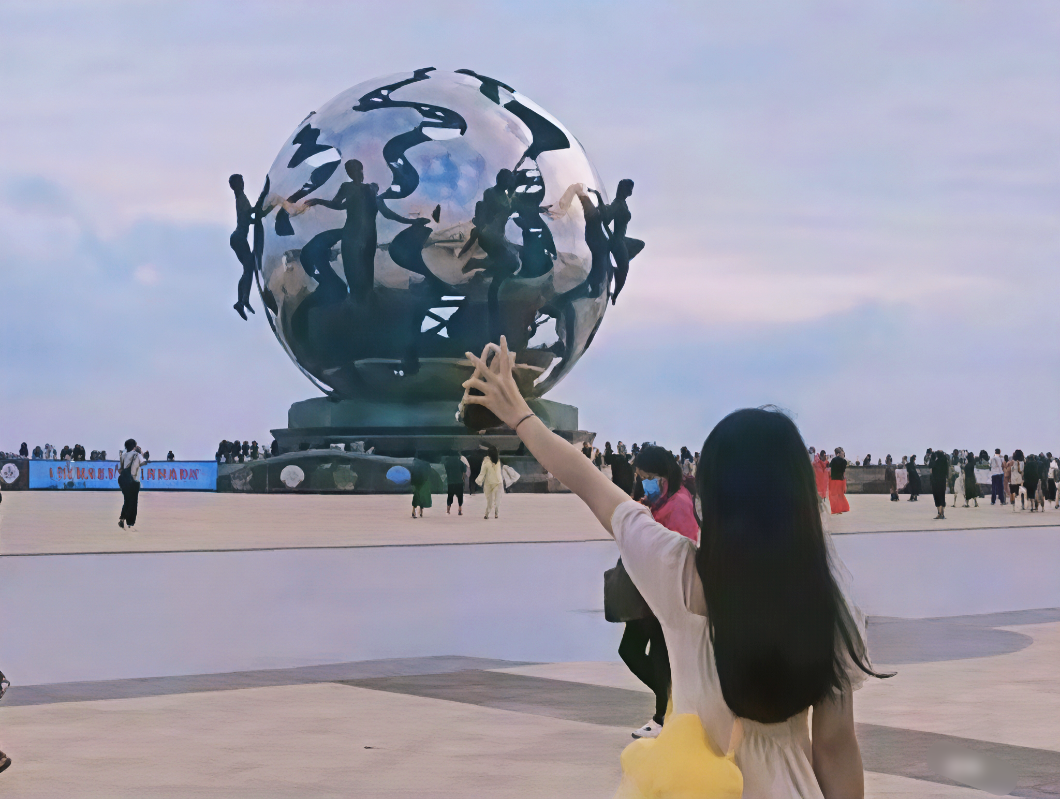 巨大的不锈钢球体如明珠般嵌在碧海银沙之间,七位婀娜的仙女手执飘带环绕其周,似在起舞。雕塑通体流线如浪,镜面折射天光云影,白日与碧波相映,夜晚则幻化为璀璨的光影明珠。既是海洋的诗歌,也是现代艺术与传说相遇的浪漫注脚。