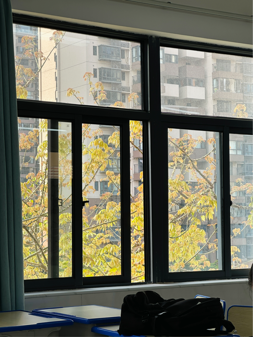 上课低头记笔记的间隙,抬头就撞见这窗绿意。深褐的枝干还带着冬天的硬朗,新长的叶子却软乎乎的,像刚新生儿的小巴掌,在风里轻轻晃,托住漏下来的阳光。窗内是摊开的课本和放在桌角的黑背包,窗外是林立的居民楼,这一窗新绿就成了最柔的缓冲——它不说“春天来了”,只悄悄把绿意递到眼前,提醒我们别只顾着赶路,别忘了抬头看看身边的生机。