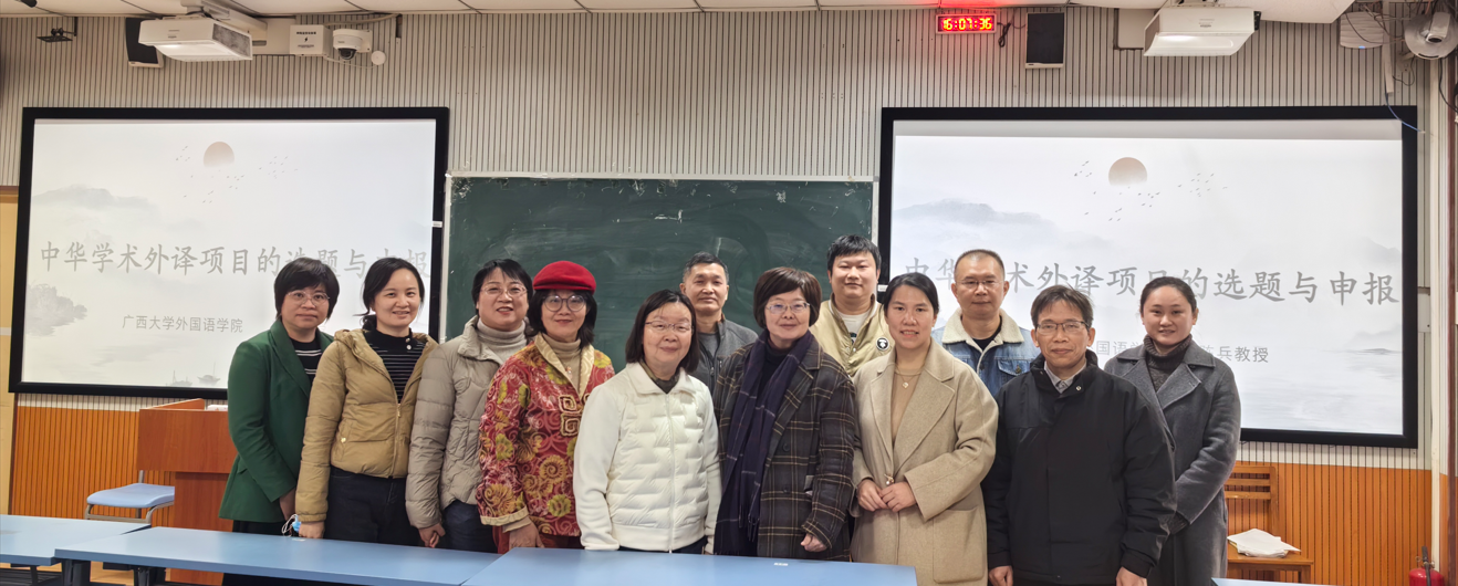 为指导教师深入了解中华学术外译项目,引导更多教师参与该项目申报,1月12日下午,外国语学院邀请了广西大学陈兵教授在beat365官网明秀校区文星楼215室主讲“中华学术外译项目的选题与申报”的专题报告。讲座由蒙岚副院长主持,我院和国际教育学院部分师生参加。