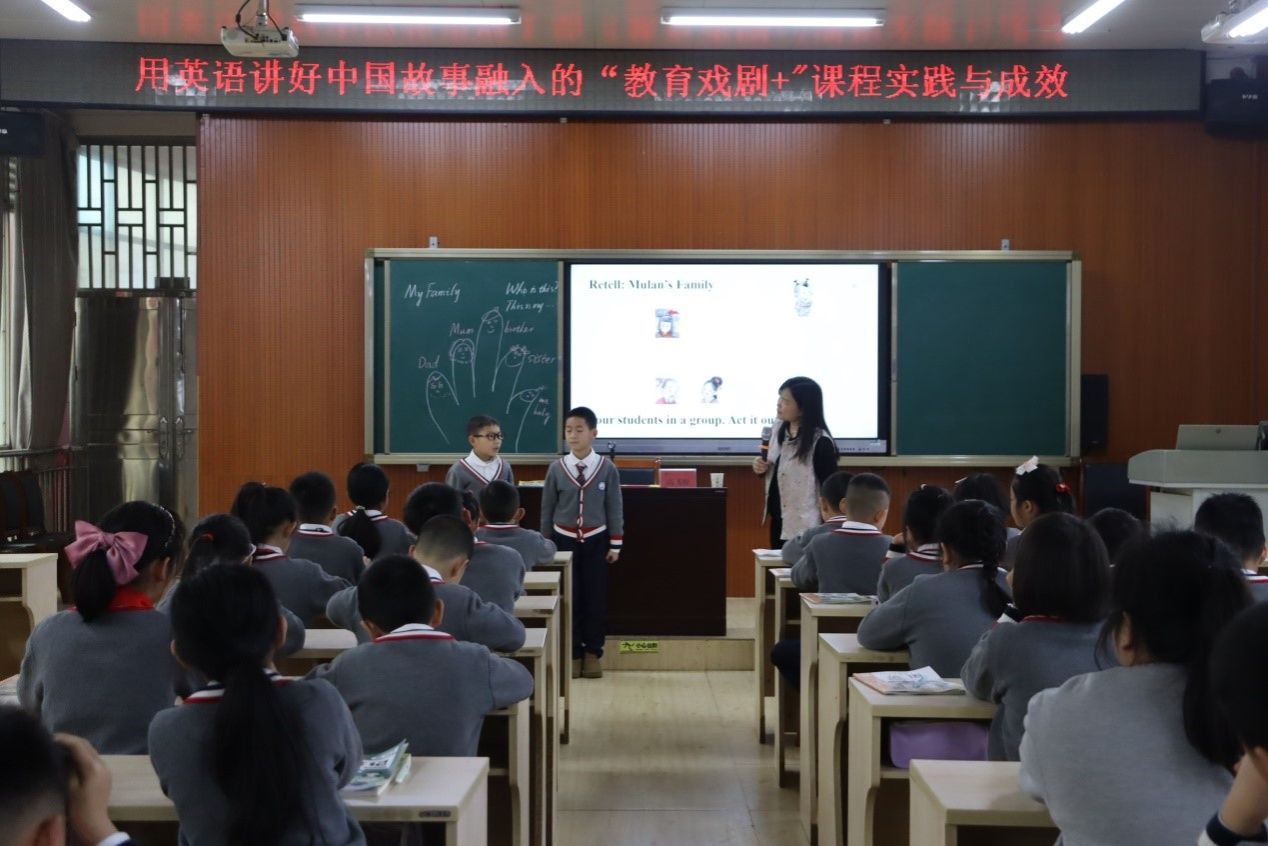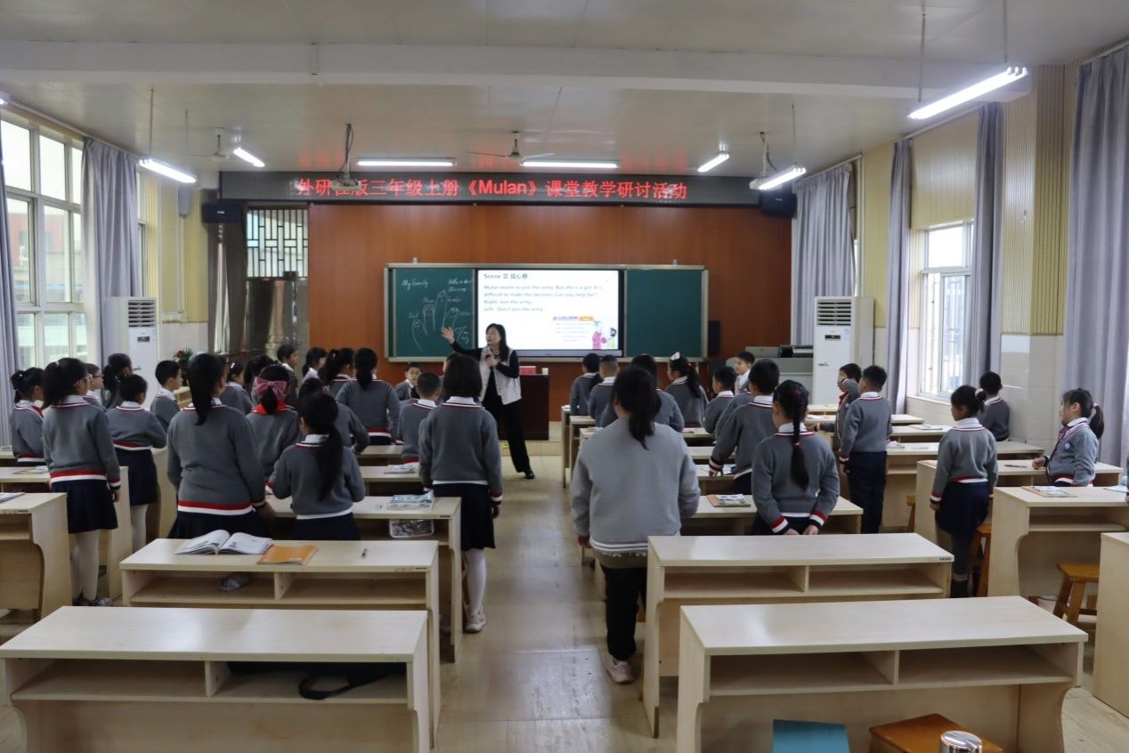 活动现场,高飞雁副院长首先呈现了一堂精彩的外研版三年级上册新教材《Mulan》示范课。课程以趣味“手指游戏”开场,瞬间点燃了课堂的热情。随后,学生们在教育戏剧范式的引导下,通过“静态画面”感受家的温馨,通过“教师入戏”体会木兰的孝顺与勇敢,通过“良心巷”领悟木兰的家国情怀,通过“音效模拟”体验战场的残酷与艰辛,通过“角色扮演”感受英雄凯旋的欢乐氛围,通过“创编台词”运用所学句型表达士兵们“同行十二年,不知木兰是女郎”的惊讶与赞叹。课堂的最后,以“我想对木兰说的一句话”为结尾,学生们自发的情感表达将课堂氛围推向高潮,实现了情感的升华。
