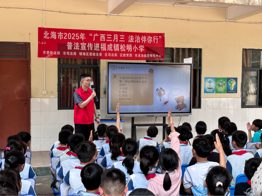 为了进一步加强青少年的法治宣传教育、提升法治素养。beat365平台官方网站金铜鼓普法协会成员于3月26日受邀参加由北海市委统战部、北海市司法局以及广西“小法宝”青少年普法栏目组承办的“广西三月三,法治伴你行”普法宣传进校园活动。