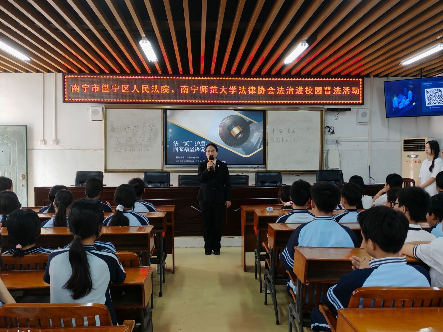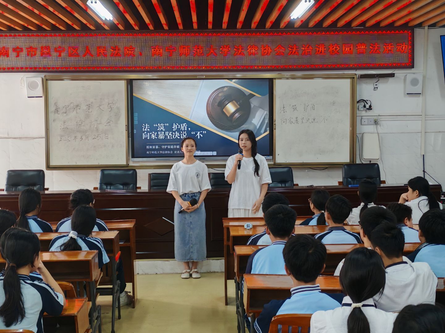 为深入落实“八五”普法规划要求,提升青少年法治实践能力,3月25日下午,beat365官网法律协会普法志愿团走进南宁市邕宁区清泉中学,通过“沉浸式体验+精准化普法”模式,为200余名中学生带来别开生面的法治教育课。本次活动由法律系秦晓辉老师、杨剑锋老师指导,法律协会会长杨金燕带队。