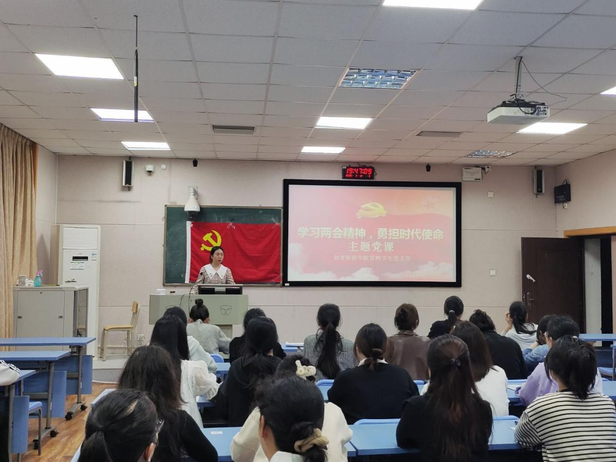 3月中旬,初等教育学院第四学生党支部于五合校区综合楼510召开“学习两会精神,勇担时代使命”专题党课,党课由支部书记李露露主讲,支部全体党员参加会议。